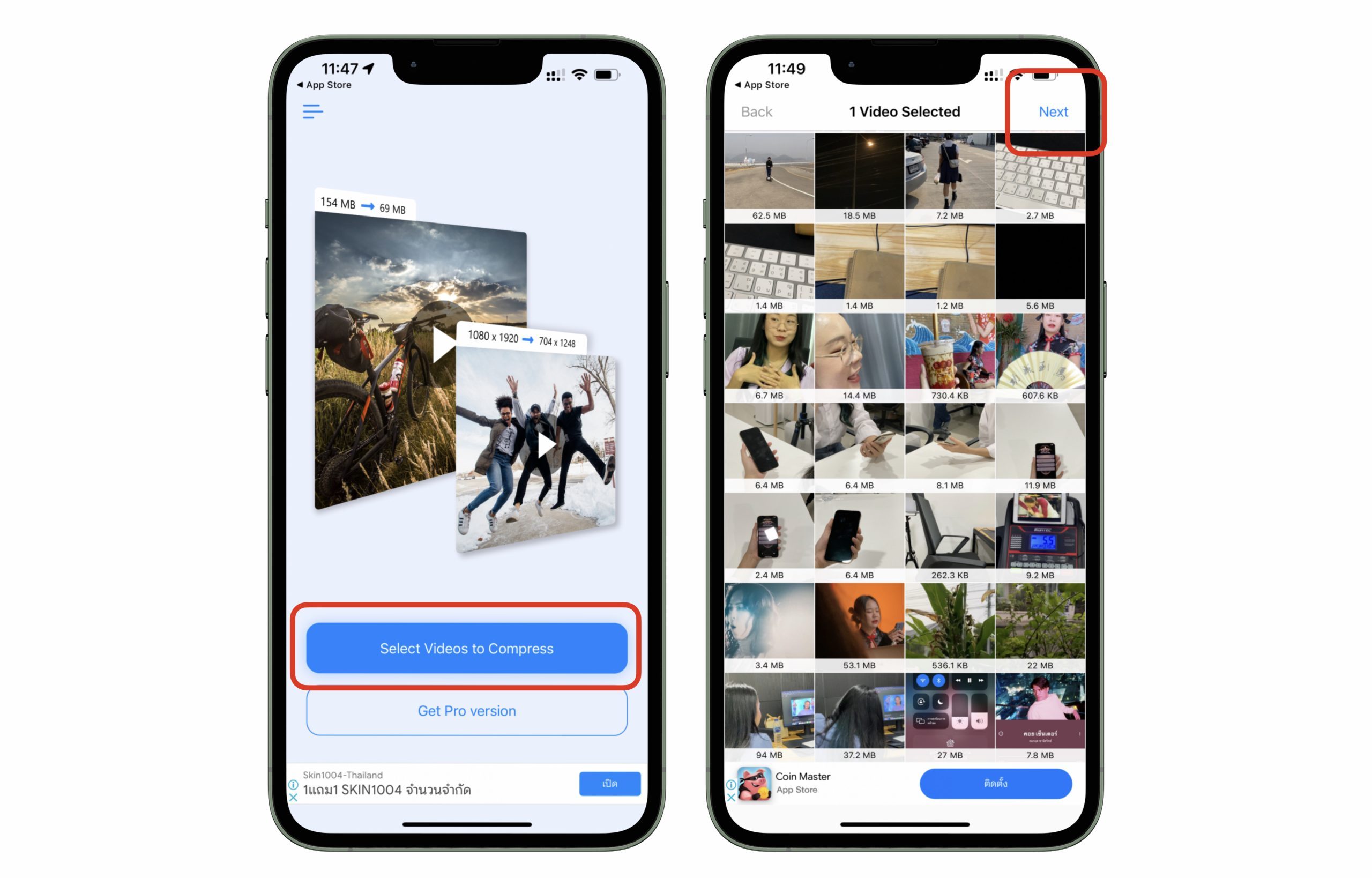 เปิดแอป > แตะ “Select Videos to Compress” > เลือกวิดีโอที่ต้องการ > แตะ “Next” (แบบฟรีเลือกได้ 1 วิดีโอ)