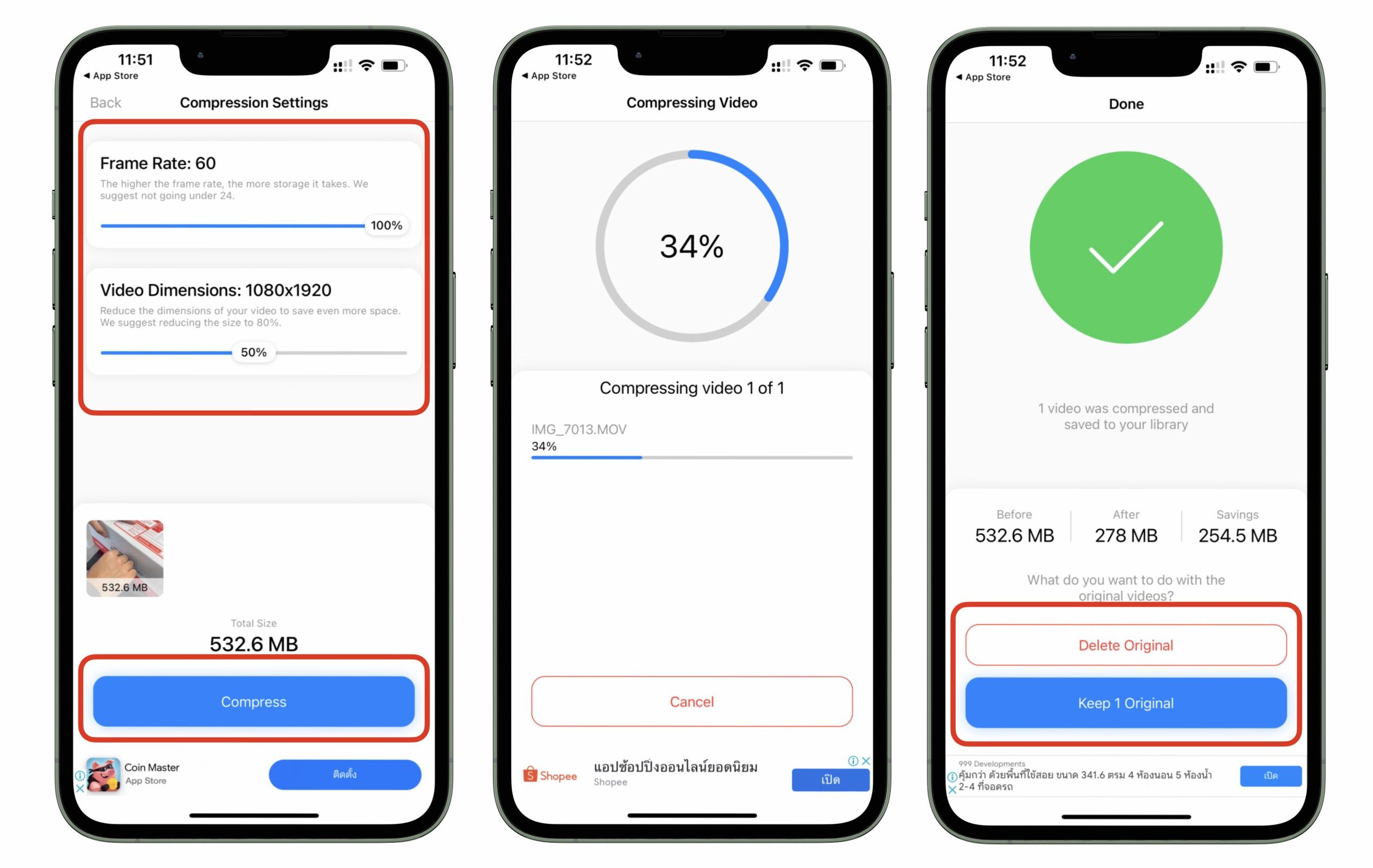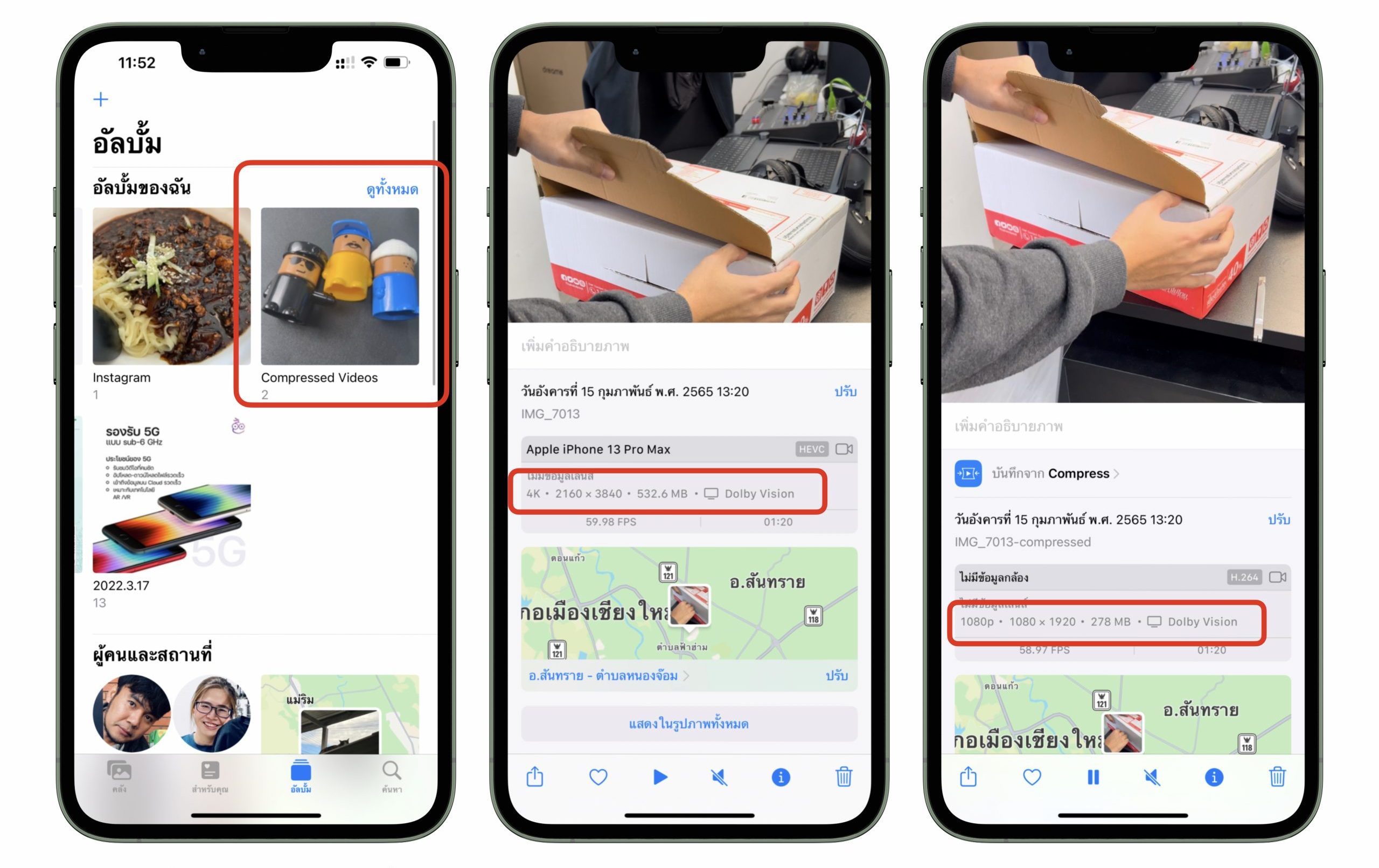 วิดีโอที่ได้จะเก็บอยู่ในอัลบั้ม “Compressed Videos” ในแอปรูปภาพ (Photos)