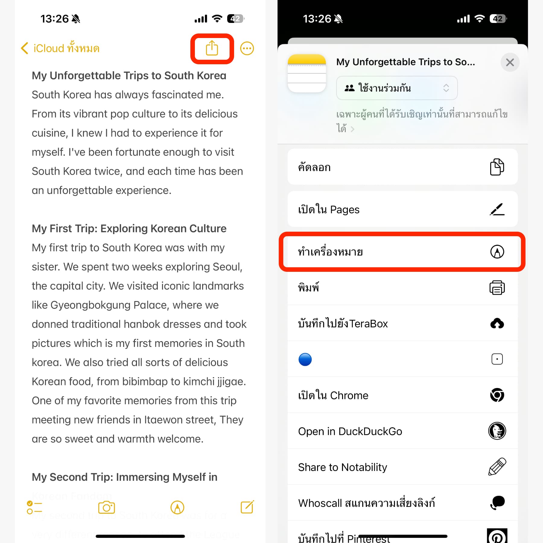 ก่อนอื่นให้เลือกโน้ตที่ต้องการก่อน จากนั้นให้แตะที่เครื่องหมายแชร์ มุมบนขวา > เลือกเมนู ทำเครื่องหมาย (Markup)