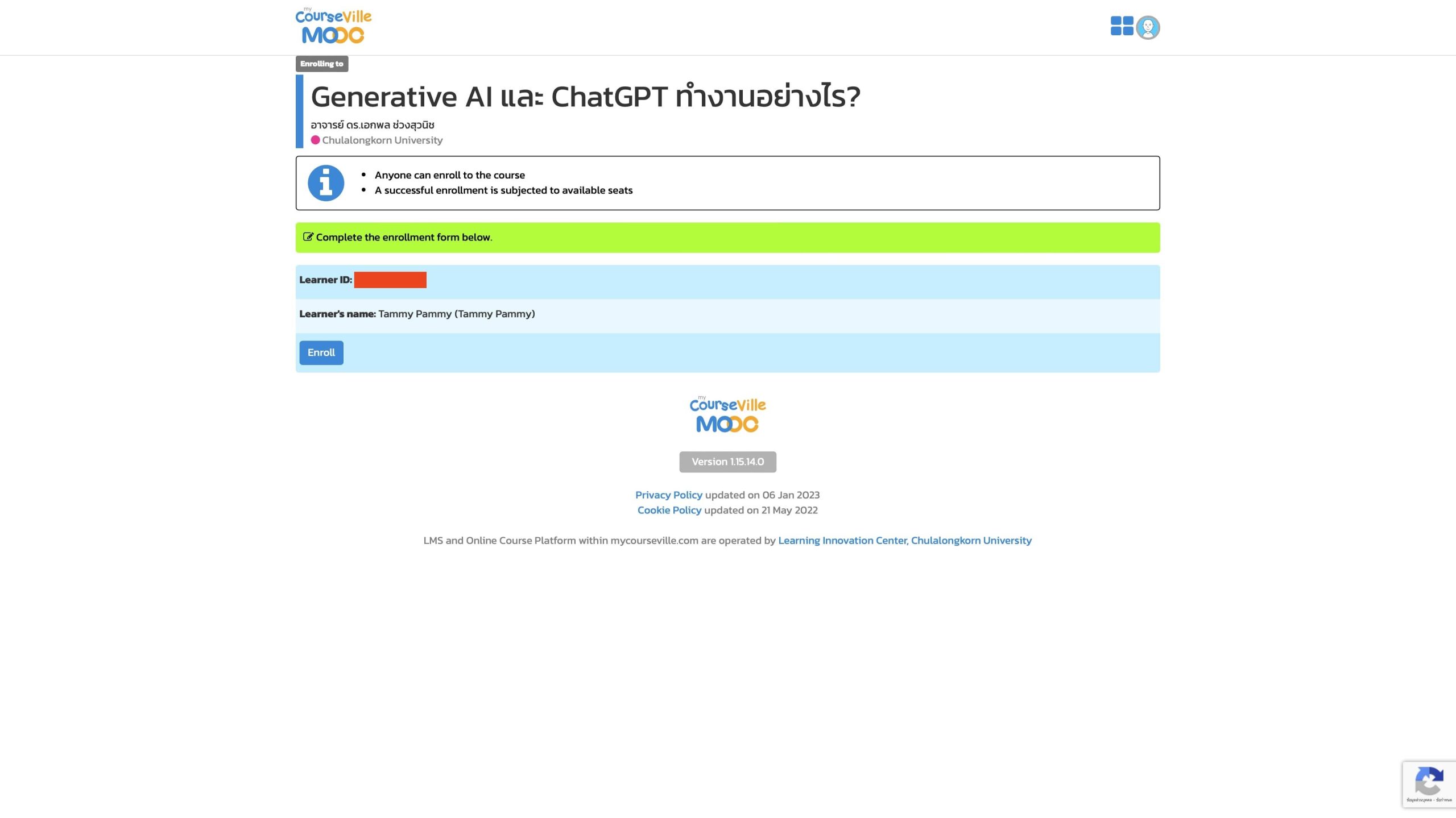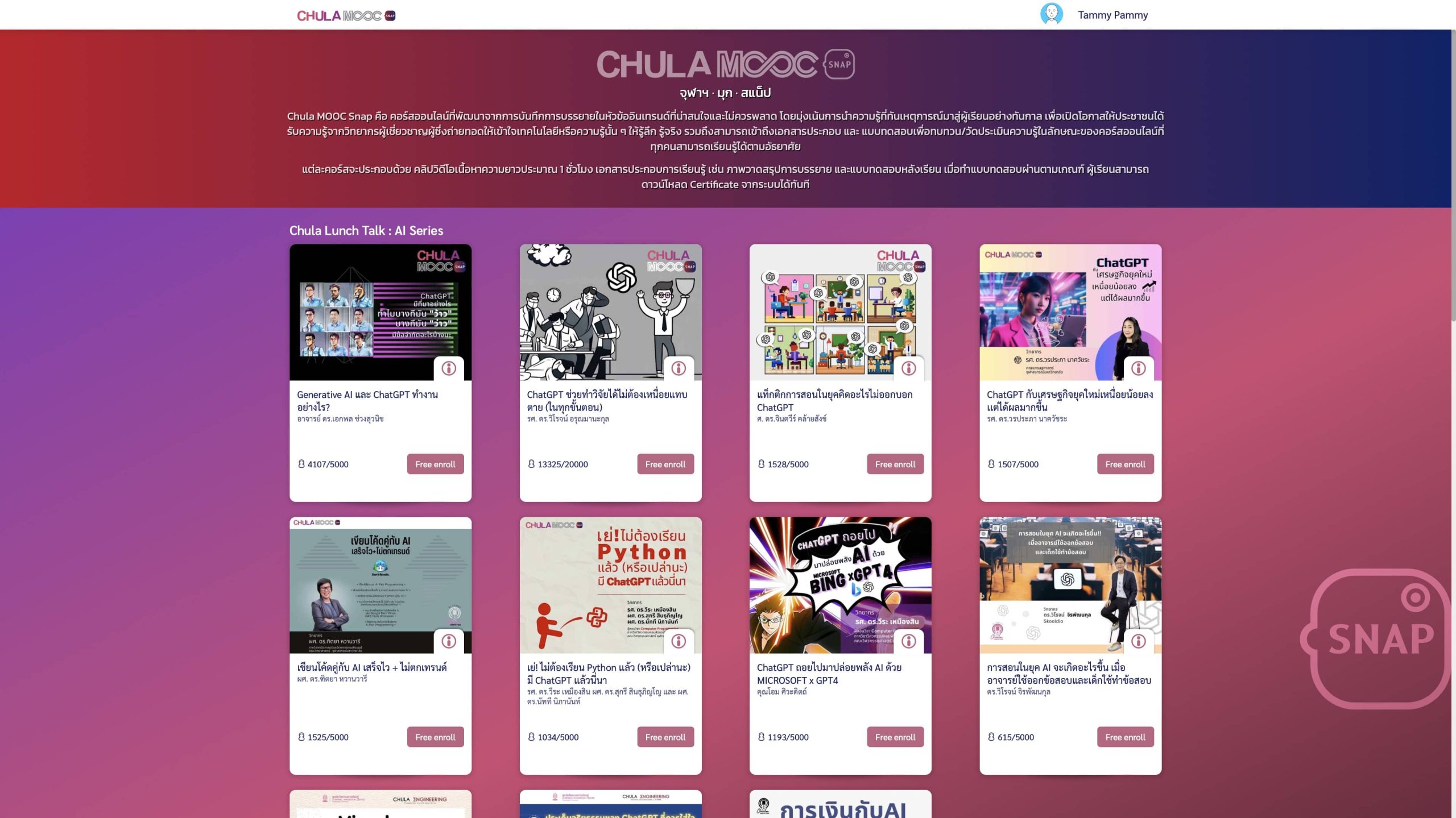 มาที่เว็บ👉🏻 Chulamoocsnap เลือกคอร์สเรียนที่ต้องการเรียนได้เลย พอเลือกได้แล้วกด “Free Enroll”