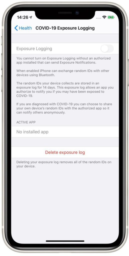 โดยไปที่ การตั้งค่า > ความเป็นส่วนตัว > สุขภาพ > COVID-19 Exposure Notifications