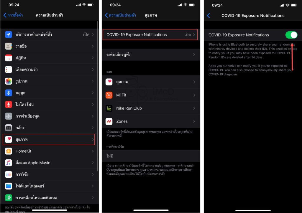 โดยไปที่ การตั้งค่า > ความเป็นส่วนตัว > สุขภาพ > COVID-19 Exposure Notifications > เลื่อนปิด