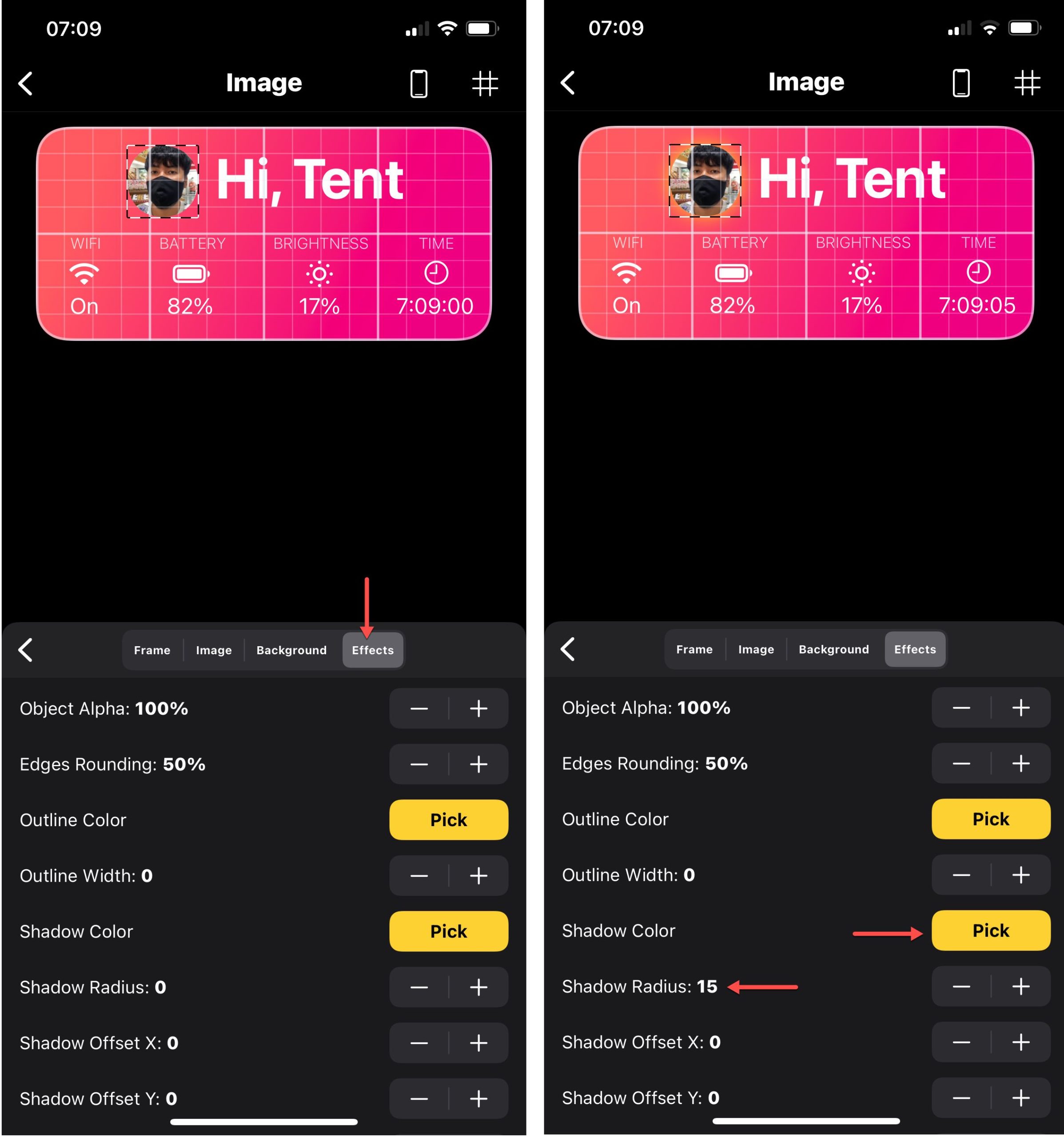 ไปที่แถบ Effects > แตะ Shadow Color เพื่อเลือกสี > เลื่อน Shadow Radius ให้เป็น 15