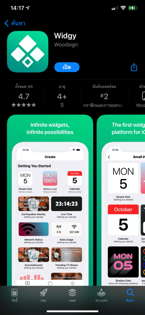 ก่อนอื่นเข้าไปดาวน์โหลดแอป Widgy ฟรีที่ App Store, แต่แบบฟรีเราจะเลือกได้เพียง 1 วิดเจ็ตเท่านั้น หากอยากได้แบบไม่จำกัดต้องซื้อในราคา 149 บาท