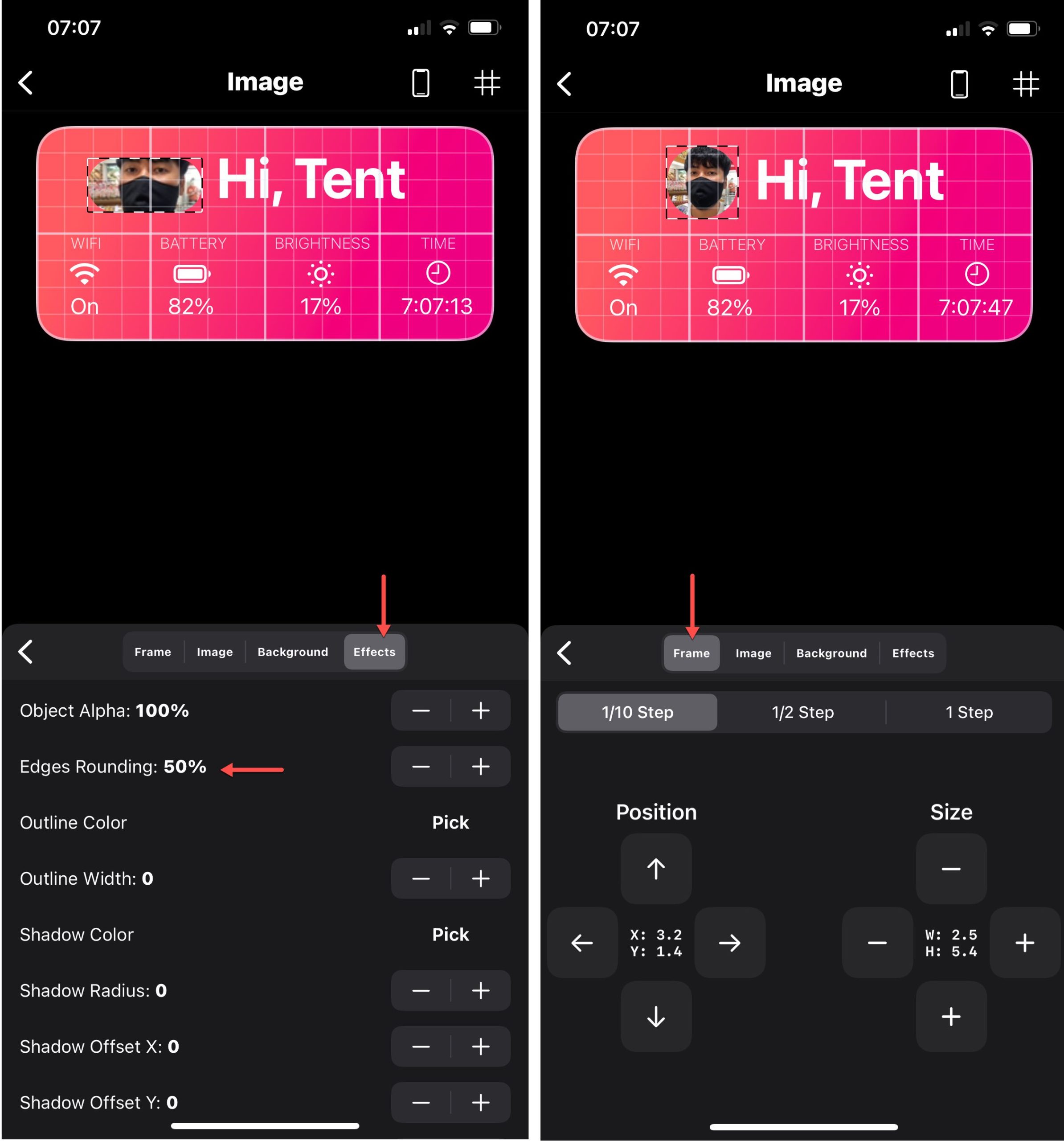ไปที่แถบ Effects > เลื่อน Edges Rounding ให้เป็น 50% > เสร็จแล้ว ไปที่แถบ Frame ปรับขนาดภาพให้เป็นวงกลมพอดี