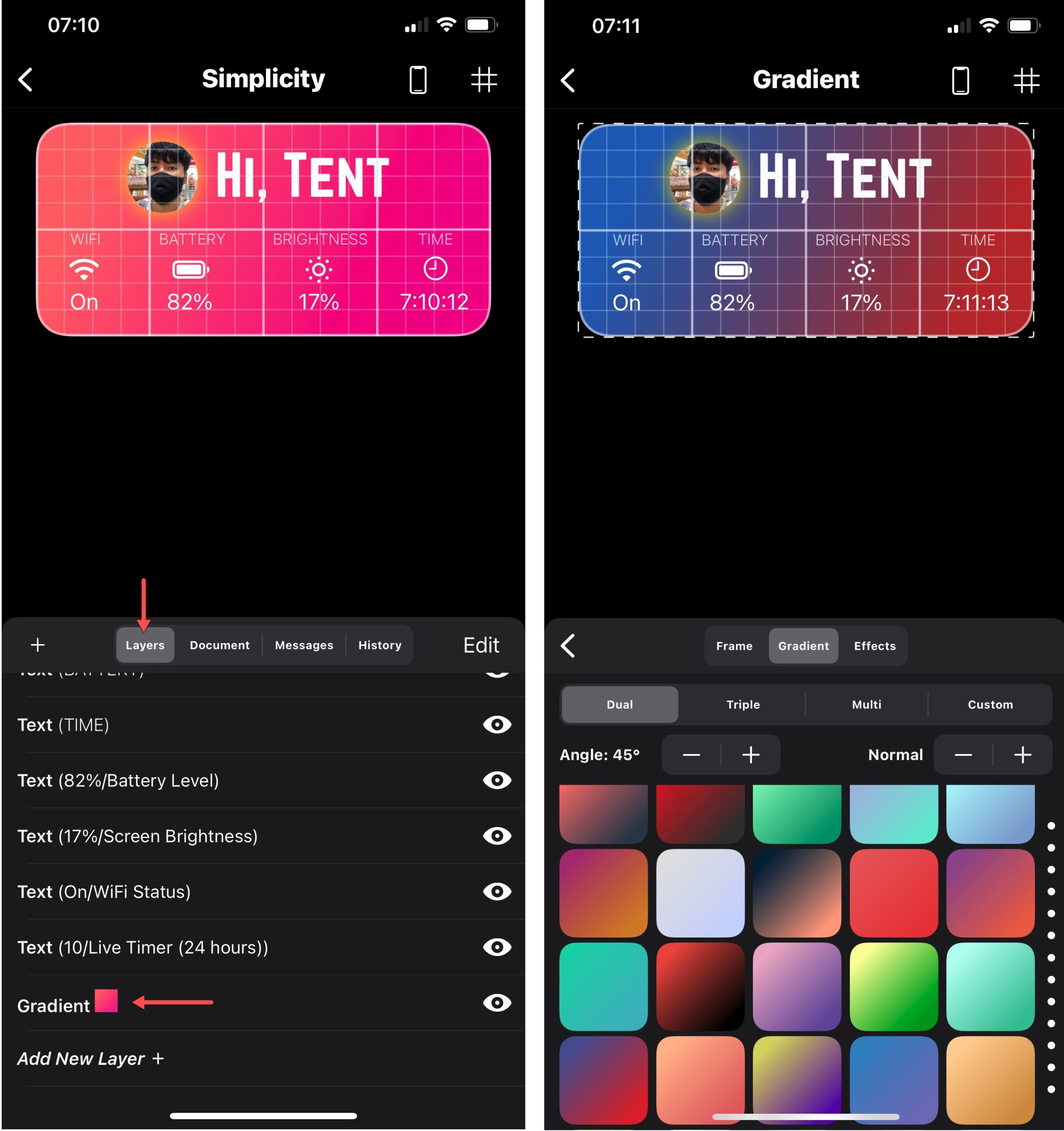 การเปลี่ยนพื้นหลังตัวนี้ให้กลับไปที่หน้า Layers > เลื่อนไปที่ Gradient > เลือกสีที่ต้องการ