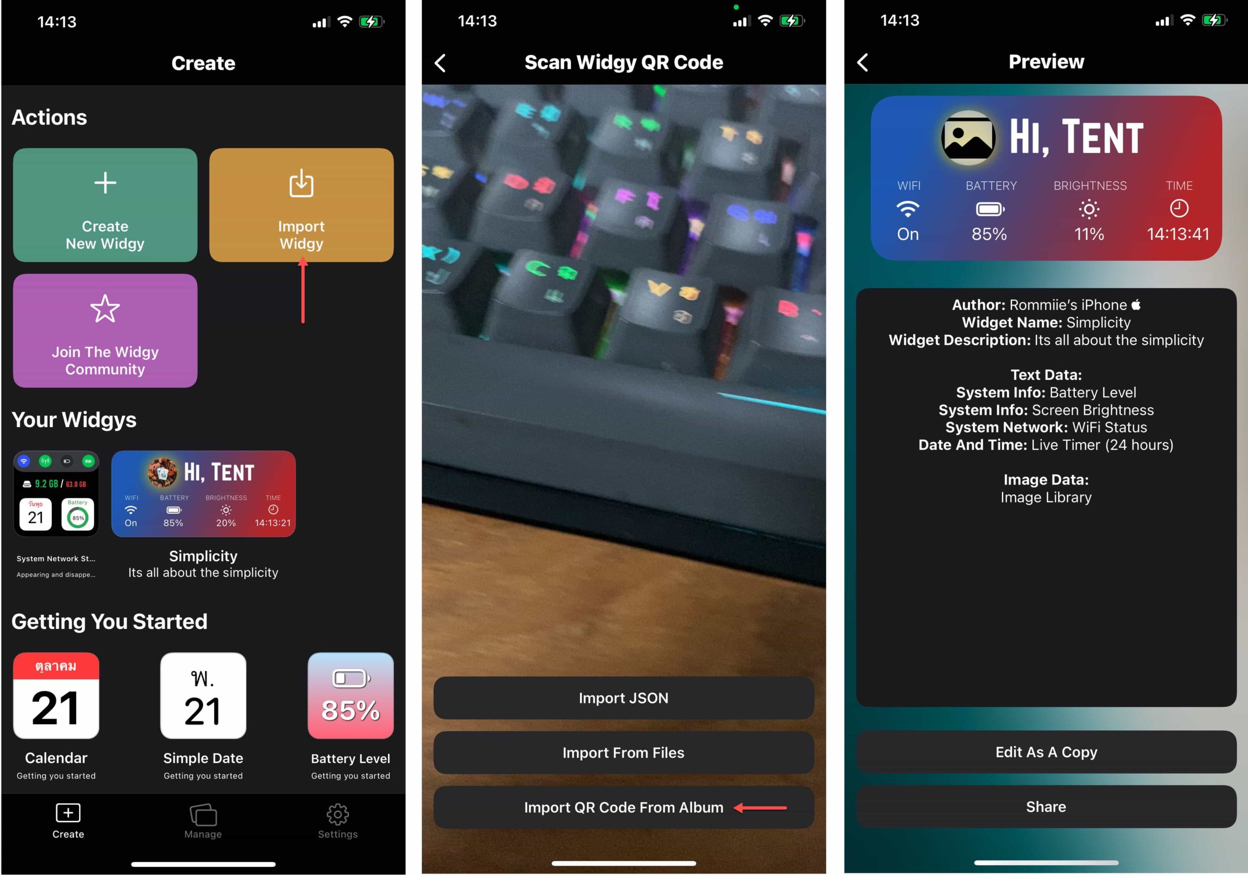เมื่อบันทึก QR Code แล้วให้เปิดแอป Widgy > แตะ Import Widgy > Import QR Code หรือจะสแกนก็ได้