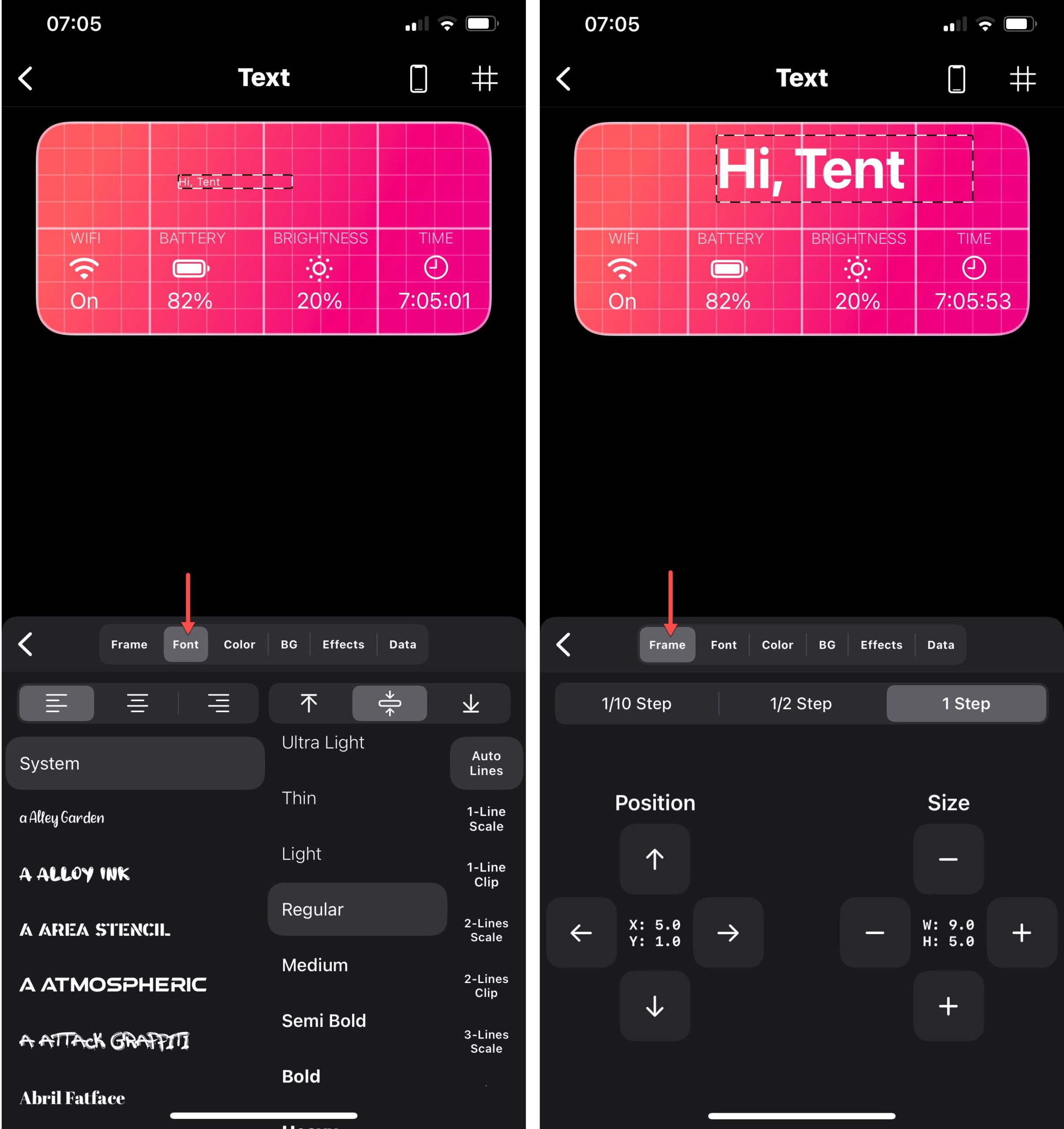 ไปที่แถบ Font เลือกฟอนต์ตามต้องการ > เสร็จแล้ว ไปที่แถบ Frame เพื่อปรับขนาดข้อความ หรือปรับตำแหน่ง (จะใช้นิ้วเลื่อนเอาที่ด้านบนก็ได้)