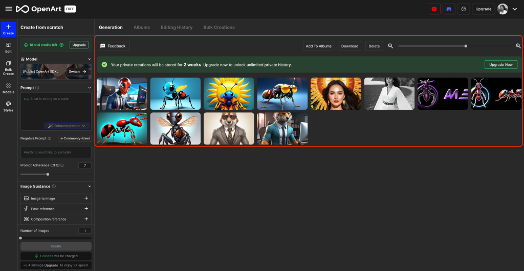 เมื่อเรา “Create” รูปภาพได้หลาย ๆ รูปภาพแล้ว ทางเว็บไซต์จะเก็บรูปภาพของเราไว้เป็นเวลา 2 สัปดาห์ และเพื่อความเป็นส่วนตัวมากยิ่งขึ้น ผู้ใช้สามารถอัปเกรดเพื่อปลดล็อกประวัติส่วนตัวแบบไม่จํากัดรูปภาพได้