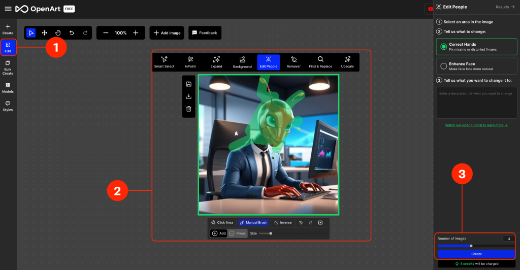 สำหรับผู้ที่สร้างรูปภาพออกมาแล้ว และได้รูปภาพที่ออกมายังไม่ตรงตามที่ต้องการ ผู้ใช้สามารถแก้ไขรูปภาพแต่ละจุดได้อีกครั้งด้วยพร็อมป์ที่ดีขึ้น และปรับแต่งตามสไตล์ตามที่เราต้องการ