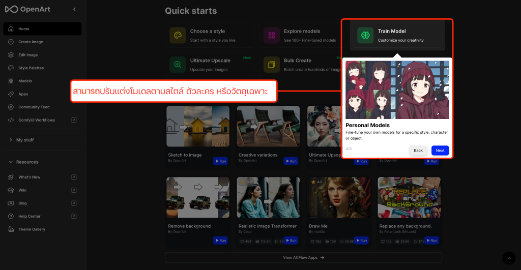 - โมเดล (Models) สามารถสร้างสรร AI แบบต่าง ๆ ได้ตามสไตล์ของเราเอง และปรับปรุงรูปภาพให้เหมาะสมตามความต้องการของผู้ใช้