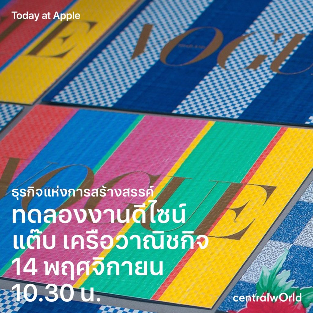 Apple กลับมาจัดเซสชั่น Today at Apple ในรูปแบบใหม่ภายใต้หัวข้อ “ธุรกิจแห่งการสร้างสรรค์” โดยร่วมกับศูนย์การค้าเซ็นทรัลเวิลด์ ชวนผู้ประกอบการมาเติมพลังสร้างสรรค์ให้แบรนด์และธุรกิจ ในเซสชั่นออนไลน์ฟรีกับนักออกแบบและเจ้าของกิจการ ผู้จะมาจุดประกายความคิดสร้างสรรค์ สร้างแรงบันดาลใจในการนำเทคโนโลยีมาเพิ่มแต้มต่อให้ธุรกิจก้าวทันโลกดิจิตอล พบกับสารพันไอเดียครีเอทีฟ ตั้งแต่การปั้นแบรนด์ การสร้างคอนเทนต์ในสื่อโซเชียล ไปจนถึงการดีไซน์บรรจุภัณฑ์ให้สวยปัง
