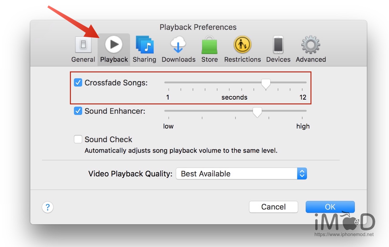 เลือกที่ Playback (การเล่น) และทำเครื่องหมายติ๊กถูกที่ Crossfade Songs (เพลงเบาลงอัตโนมัติ) ปรับตั้งค่าเวลาตามต้องการ