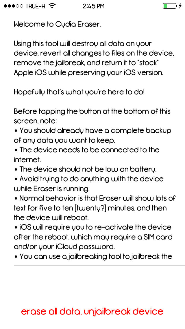 หมายความว่า ยกตัวอย่างหากคุณเจลเบรค iOS 9.3.3 แล้วเกิดไม่ชอบใจอยากล้างเครื่องหรือลบ Cydia ออก แต่ว่ายังอยากได้ iOS 9.3.3 ตัวเดิมไว้(ซึ่งอนาคตหากล้างเครื่องผ่าน iTunes คุณจะได้ iOS 9.3.4 หรือ iOS 10 นั่นเอง) ก็สามารถใช้แอปทวีคนี้แหละลบเจลเบรคออกจากเครื่องได้