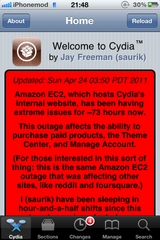 Amazon CE2 ซึ่งเป็นผู้ให้บริการโฮสติ้งที่ทาง Cydia ได้ใช้บริการอยู่นั้นได้เกิดปัญหาขึ้นมากว่า 72 ชม. แล้วและยังไม่สามารถแก้ไขปัญหาได้ ผลที่เกิดขึ้นคือฟีเจอร์อย่าง ระบบจัดการการซื้อขายแอปฯ, ตัวกลางการจัดการเรื่องของธีม (Theme Center) และระบบจัดการข้อมูลสมาชิกนั้นไม่สามารถใช้การได้