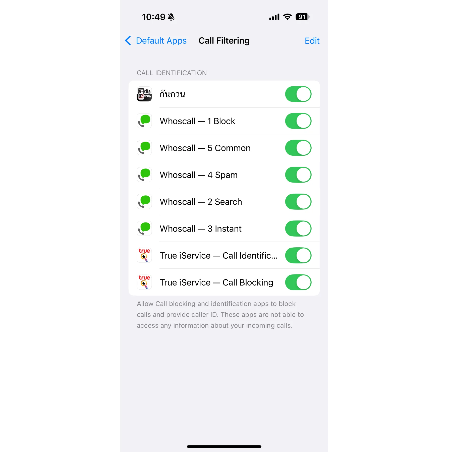 - การกรองการโทร (Call Filtering): เลือกแอปที่ใช้ในการกรองการโทร เช่น จากแอป whoscall หรือแอปกันกวน เปิดใช้งานเพื่อบล็อกเบอร์มิจฉาชีพ และเบอร์แปลก