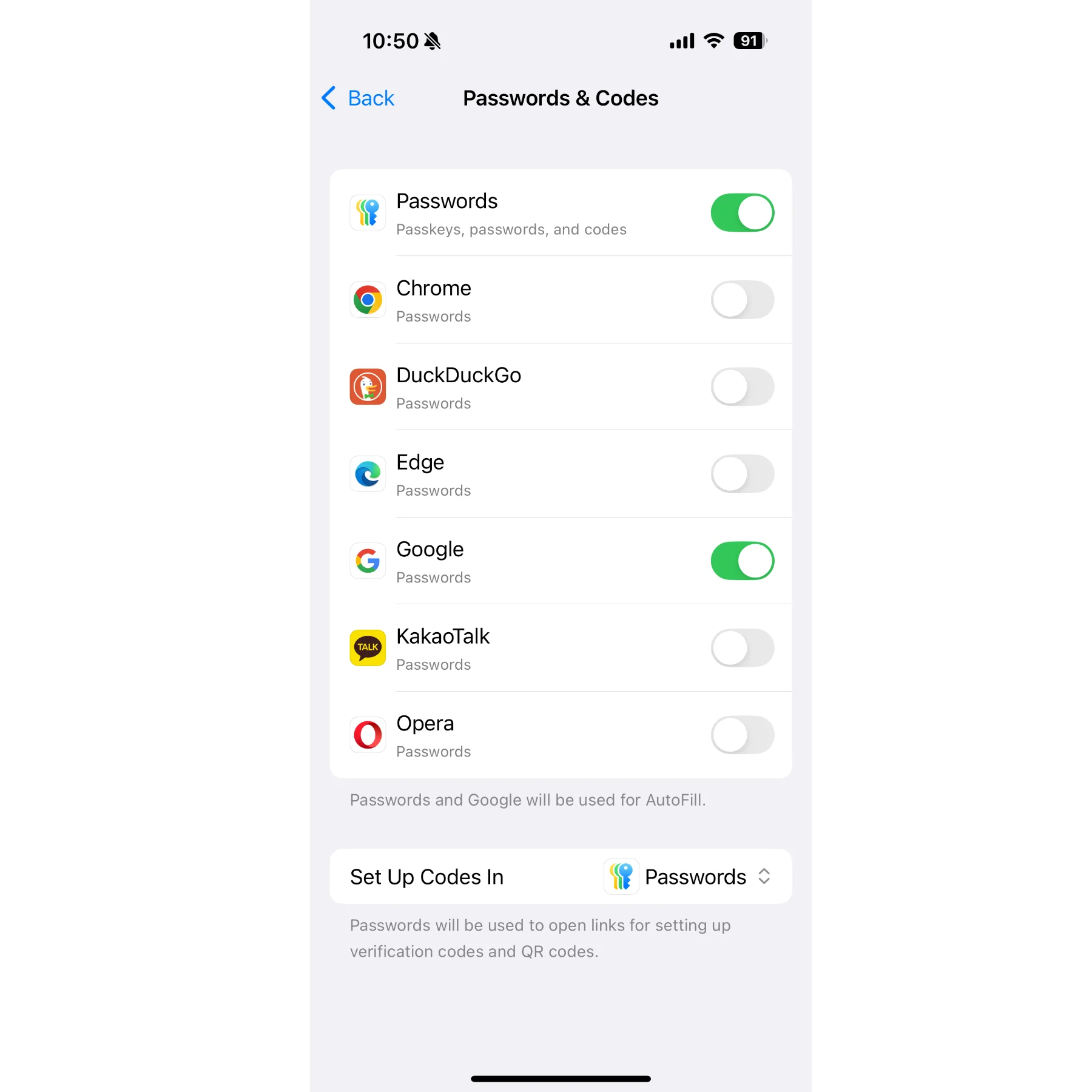 - รหัสผ่านและรหัส (Passwords & Codes): เลือกแอปที่ใช้สำหรับการกรอกอัตโนมัติของรหัสผ่านและรหัสยืนยันตัวตน