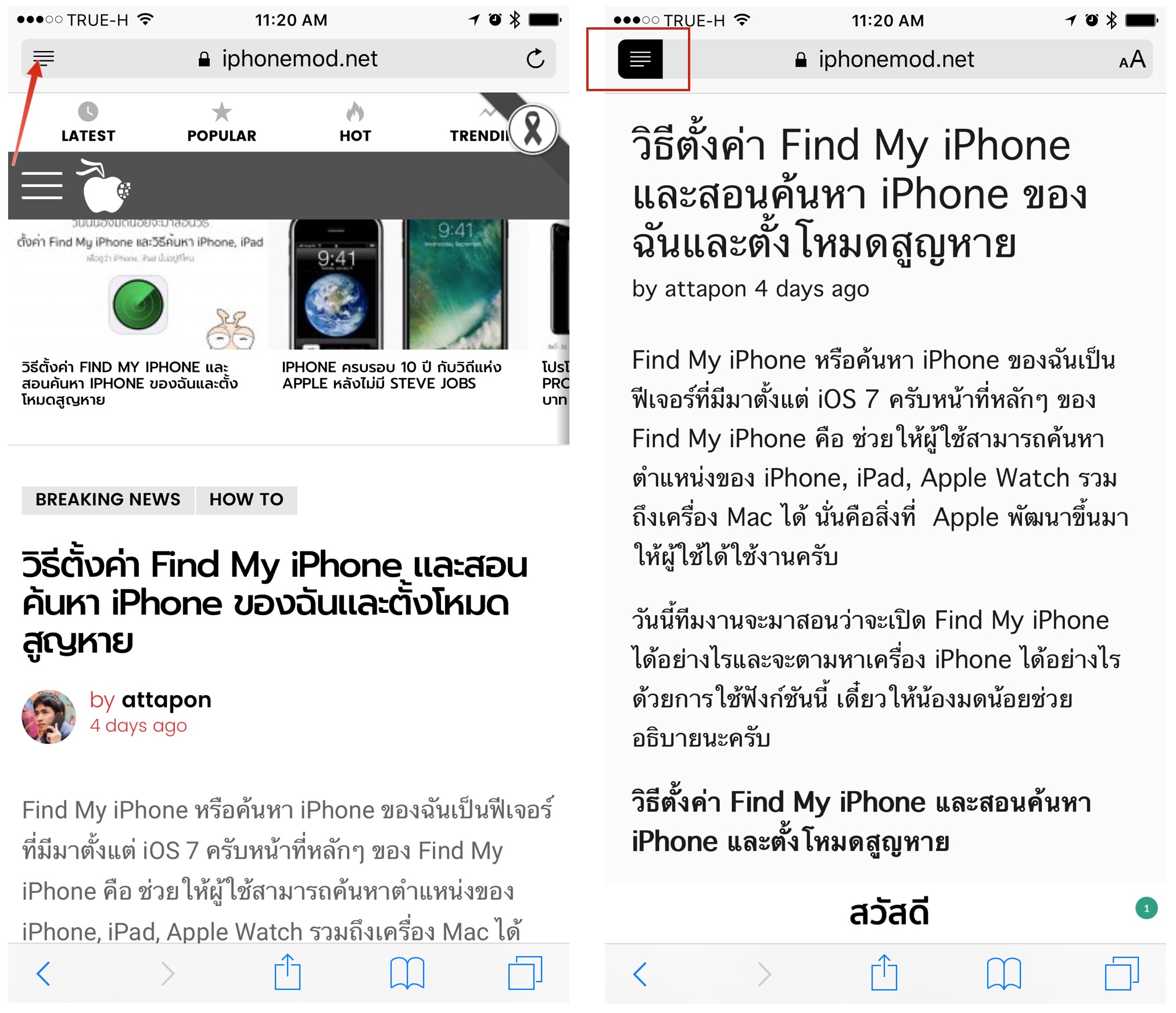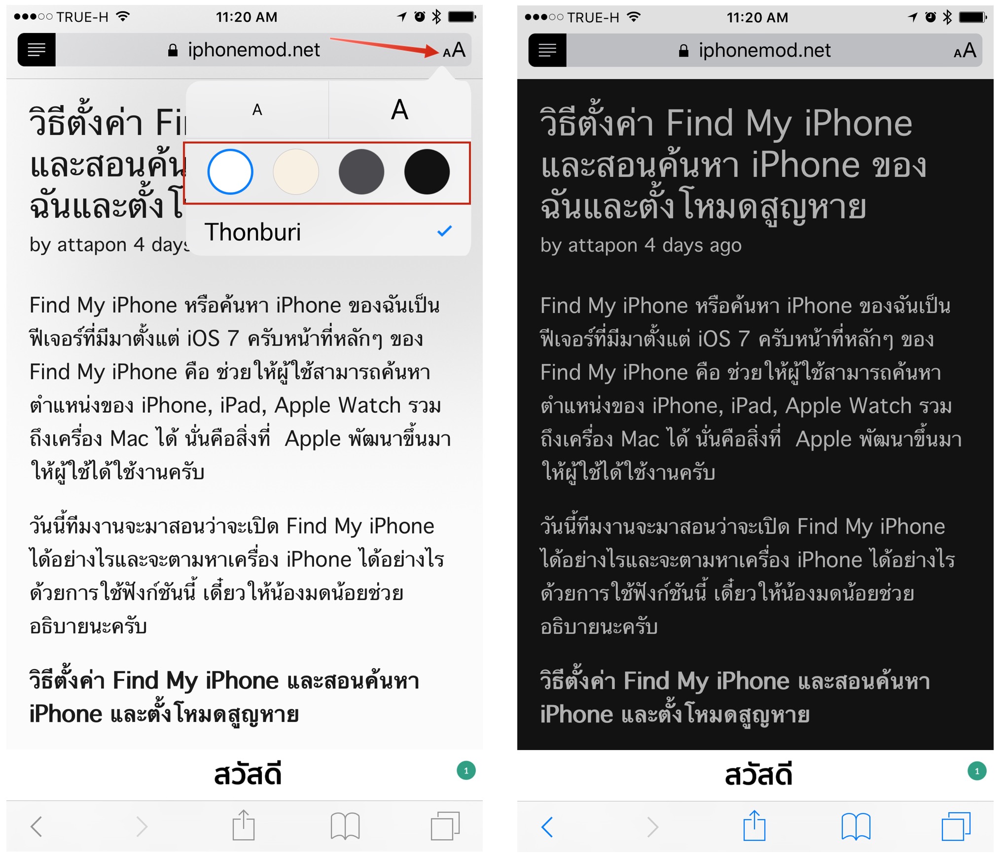 ขั้นต่อไปให้เลือกที่ตัวอักษร AA ที่มุมบนขวาแล้วเลือกสีพื้นหลังตามต้องการ เพียงเท่านี้เราก็จะได้ Dark Mode บน Safari ไว้อ่านในยามค่ำคืนเป็นที่เรียบร้อยครับ