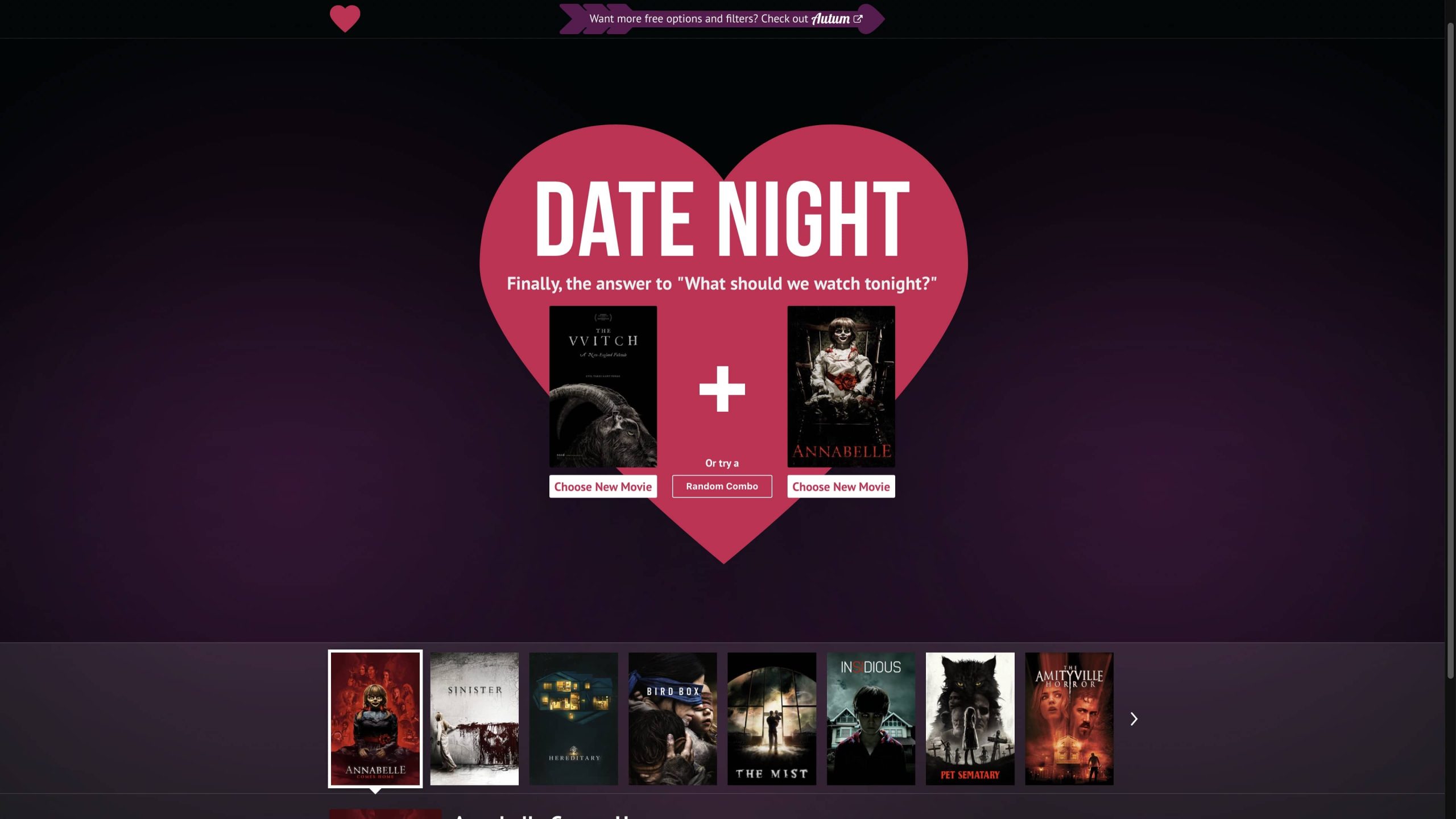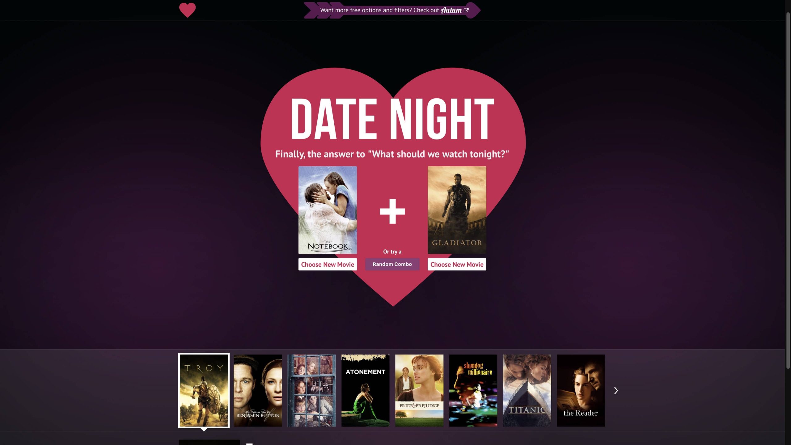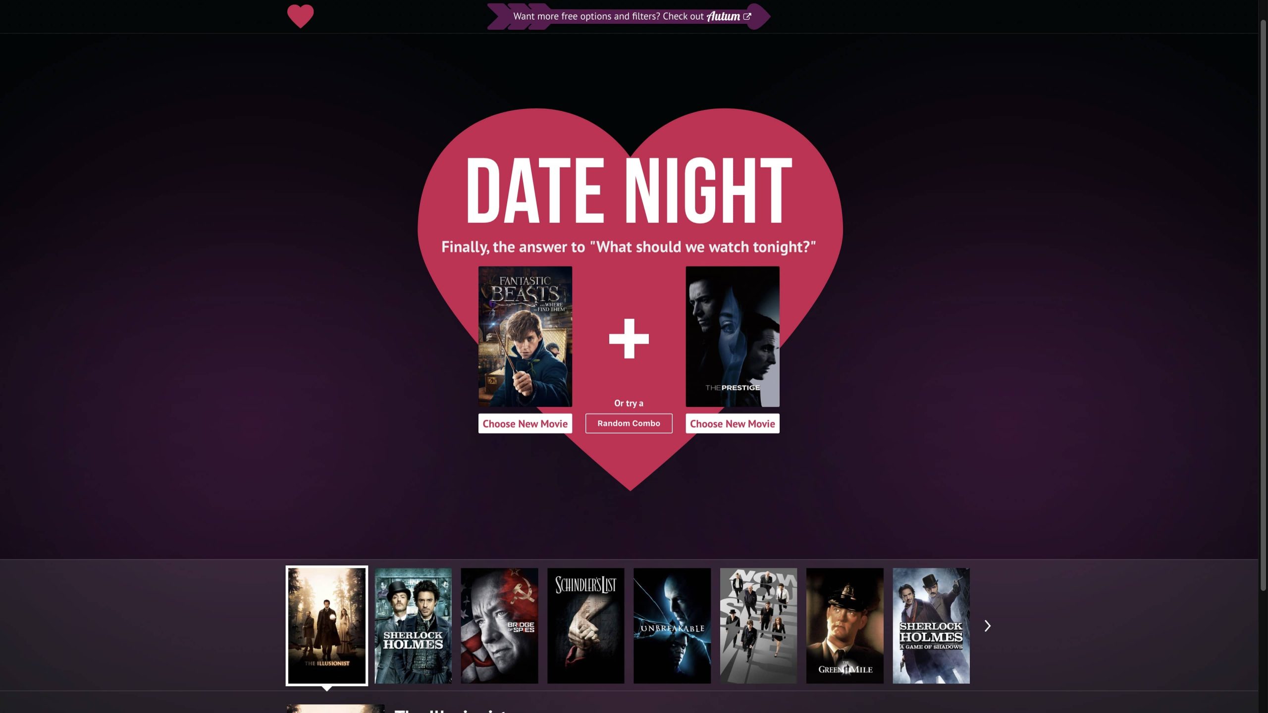 เพื่อน ๆ เคยประสบปัญหาชอบหนังคนละสไตล์กับเพื่อน หรือแฟน แล้วไม่รู้จะดูหนังอะไรเว็บ Datenightmovies ช่วยคุณได้ เว็บนี้จะสุ่มหนังจากเรื่องที่เรากับเพื่อนหรือแฟน เลือกไว้ 2 เรื่อง