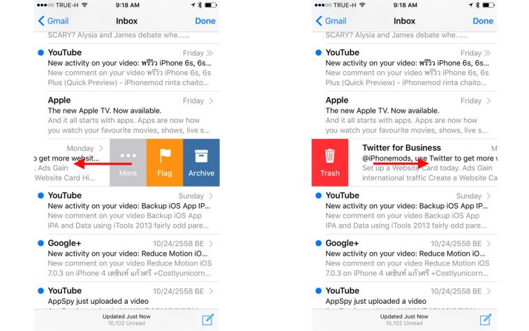 จากนั้นจะพบว่าเมื่อ Swipe Right แล้วสามารถลบ (Trash) อีเมลของ Gmail ได้เป็นที่เรียบร้อยครับ