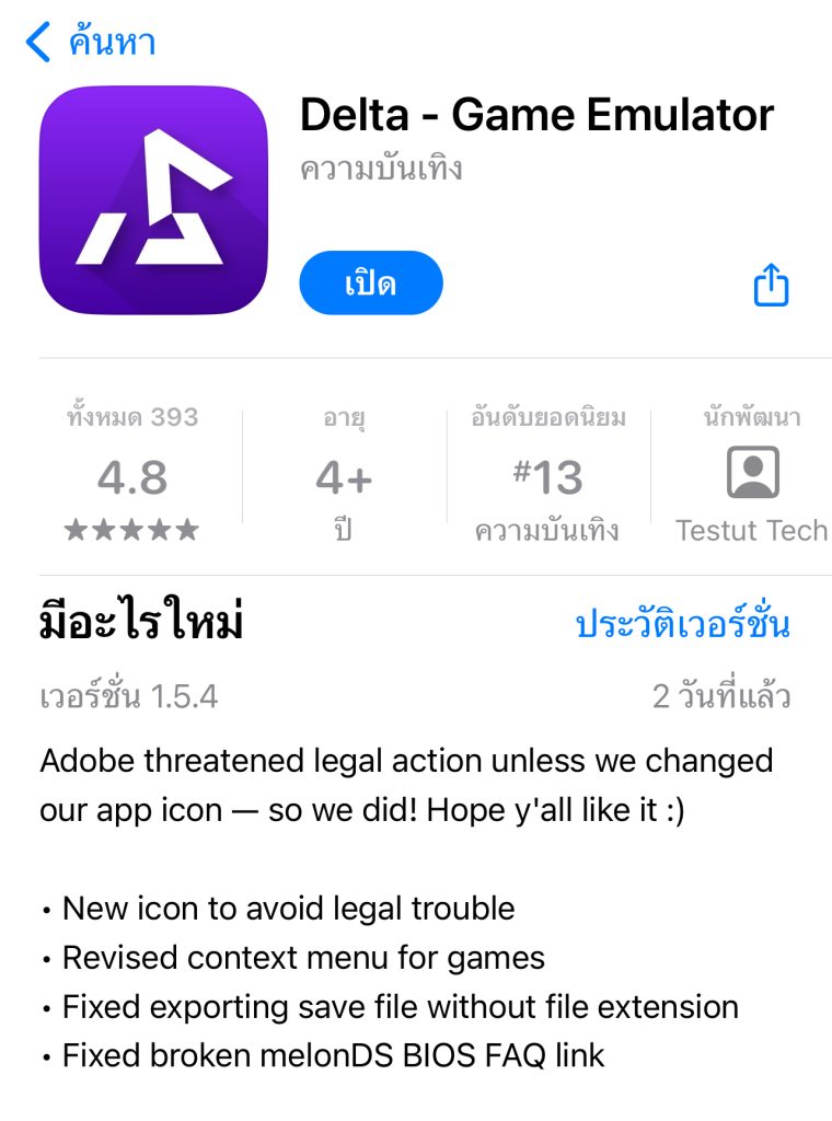 ทางนักพัฒนาแอป Delta โปรแกรมจําลอง Game Boy ยอดนิยมนี้ได้อัปเดตไอคอนของแอป เพื่อหลีกเลี่ยงการดําเนินการทางกฎหมายที่อาจเกิดขึ้นจาก Adobe นักพัฒนาที่อยู่เบื้องหลังโปรแกรมจําลอง Game Boy ยอดนิยมอย่าง