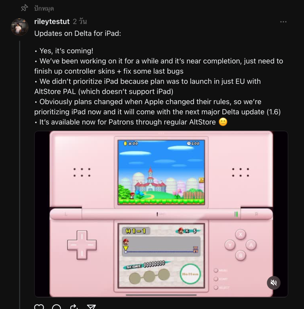 ล่าสุด Riley Testut ผู้พัฒนาแอปได้ยืนยันแล้วว่า Delta ใกล้จะพร้อมเปิดตัวบน iPad แล้ว เวอร์ชั่น iPad ใกล้เสร็จสมบูรณ์แล้ว เหลือเพียงการปรับแต่งสกินของคอนโทรลเลอร์และการแก้ไขบั๊กบางอย่างเท่านั้น