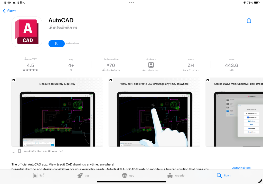 • ทำงานร่วมกับ AutoCAD เวอร์ชันเต็ม ไฟล์ที่แก้ไขบน AutoCAD Mobile App สามารถนำไปเปิดบนโปรแกรม AutoCAD เวอร์ชันเต็มบนคอมพิวเตอร์ได้