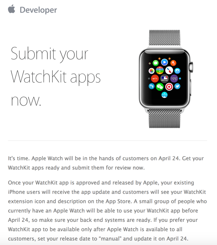 Apple ได้ทำการเชื้อเชิญให้นักพัฒนาทั้งหลายส่งการอัปเดตของ App ตัวเองเพื่อให้รองรับ Apple Watch (Watch App) จำนวนกว่า 1.2 ล้านแอปพลิเคชัน หลังจากที่อนุญาตเฉพาะคู่ค้าได้ทดลองเมื่อสัปดาห์ที่ผ่านมา