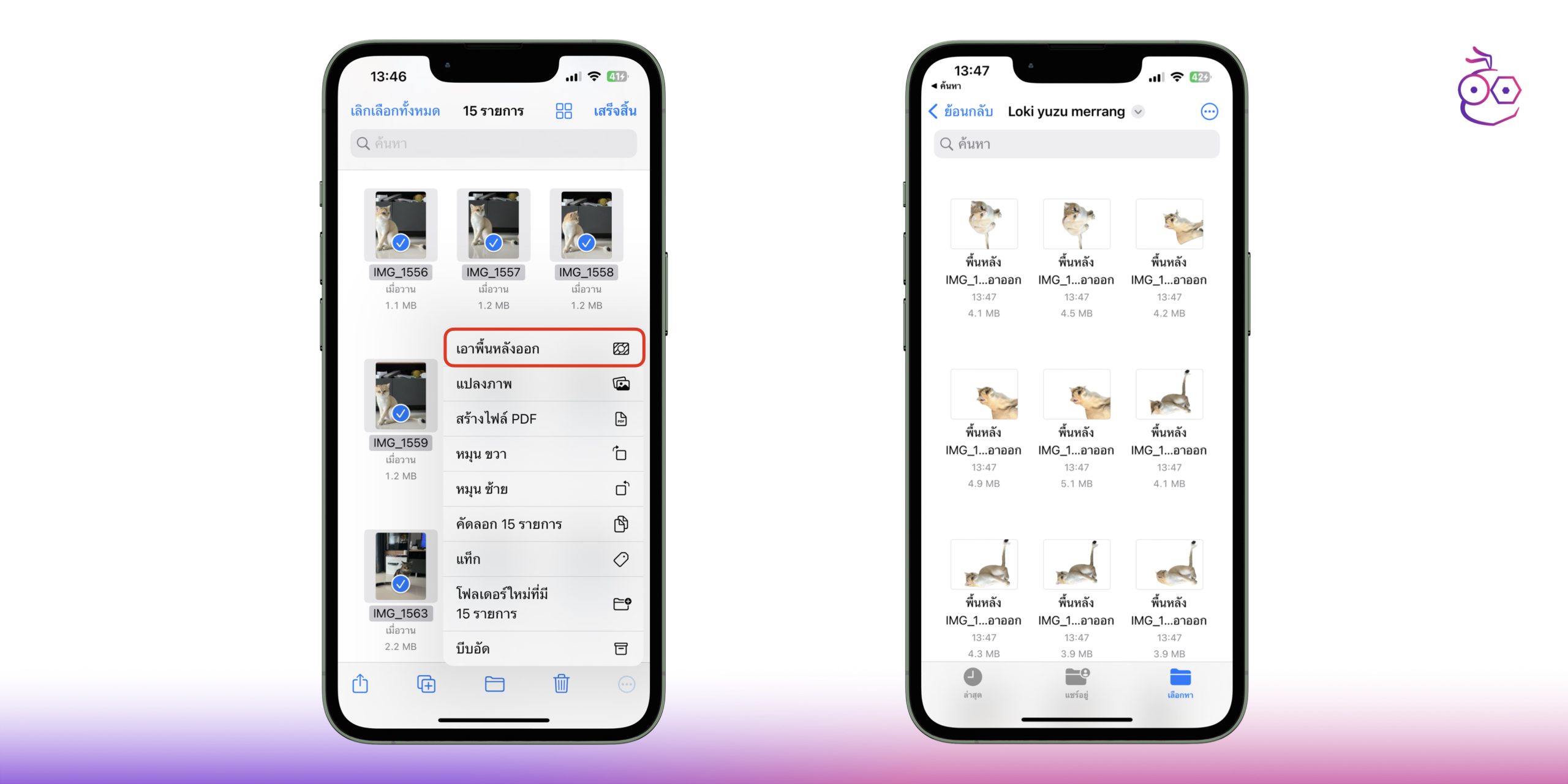 - เข้าไปยังแอปไฟล์ เลือกรูปภาพทั้งหมดที่ต้องการ จากนั้นเลือก เอาพื้นหลังออก