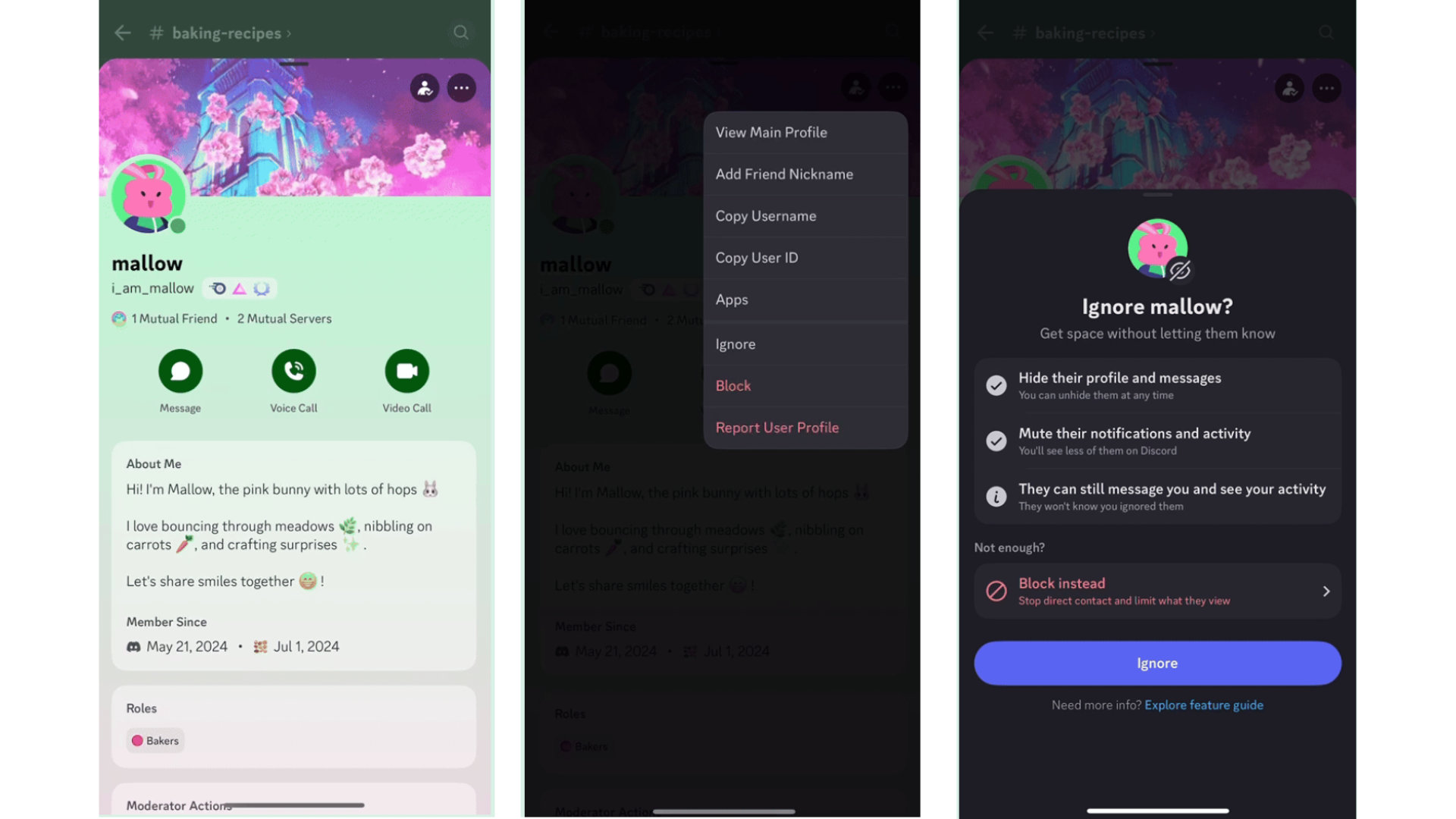 สำหรับผู้ใช้มือถือ การ Ignore สามารถทำได้โดยการแตะที่อวาตาร์ของผู้ใช้ จากนั้นแตะที่สัญลักษณ์จุดสามจุด (…) และเลือก “Ignore”