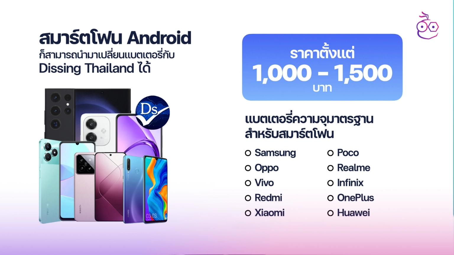 Dissing Thailand มีแบตเตอรี่ “แบบเพิ่มความจุ” สำหรับ iPhone ทุกรุ่น และแบตเตอรี่มาตรฐานสำหรับสมาร์ตโฟน Android มากกว่า 400 รุ่น สินค้าทุกชิ้นได้รับมาตรฐาน มอก. มั่นใจด้านความปลอดภัย และรับประกันแบตเตอรี่ 1 ปีเต็มด้วย !