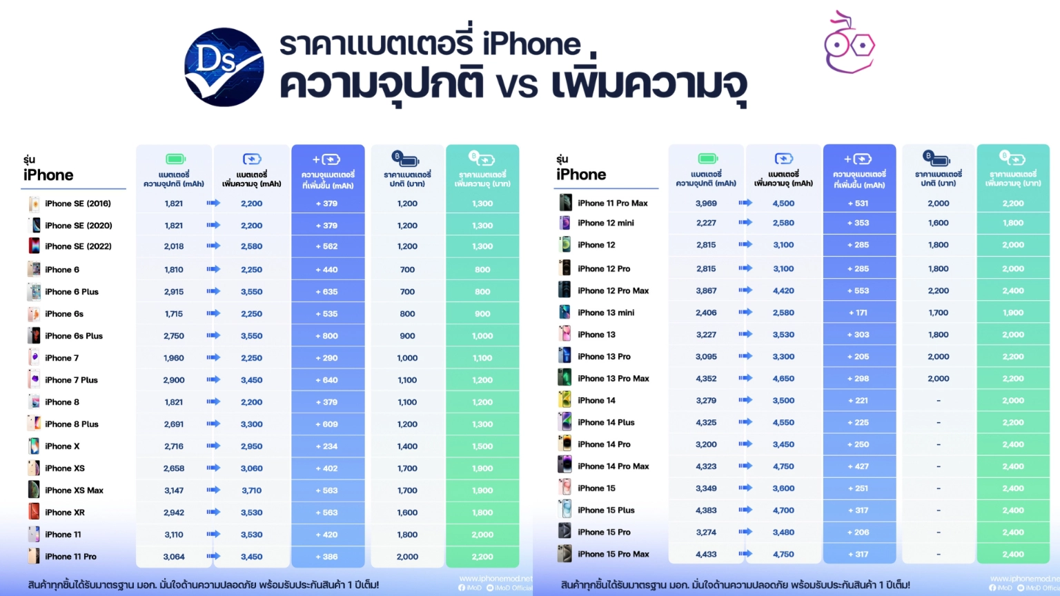 | รุ่น iPhone | แบตเตอรี่ความจุปกติ (mAh) | แบตเตอรี่เพิ่มความจุ (mAh) | ความจุแบตเตอรี่ที่เพิ่มขึ้น (mAh) | ราคาแบตเตอรี่ปกติ (mAh) | ราคาแบตเตอรี่เพิ่มความจุ (mAh) |