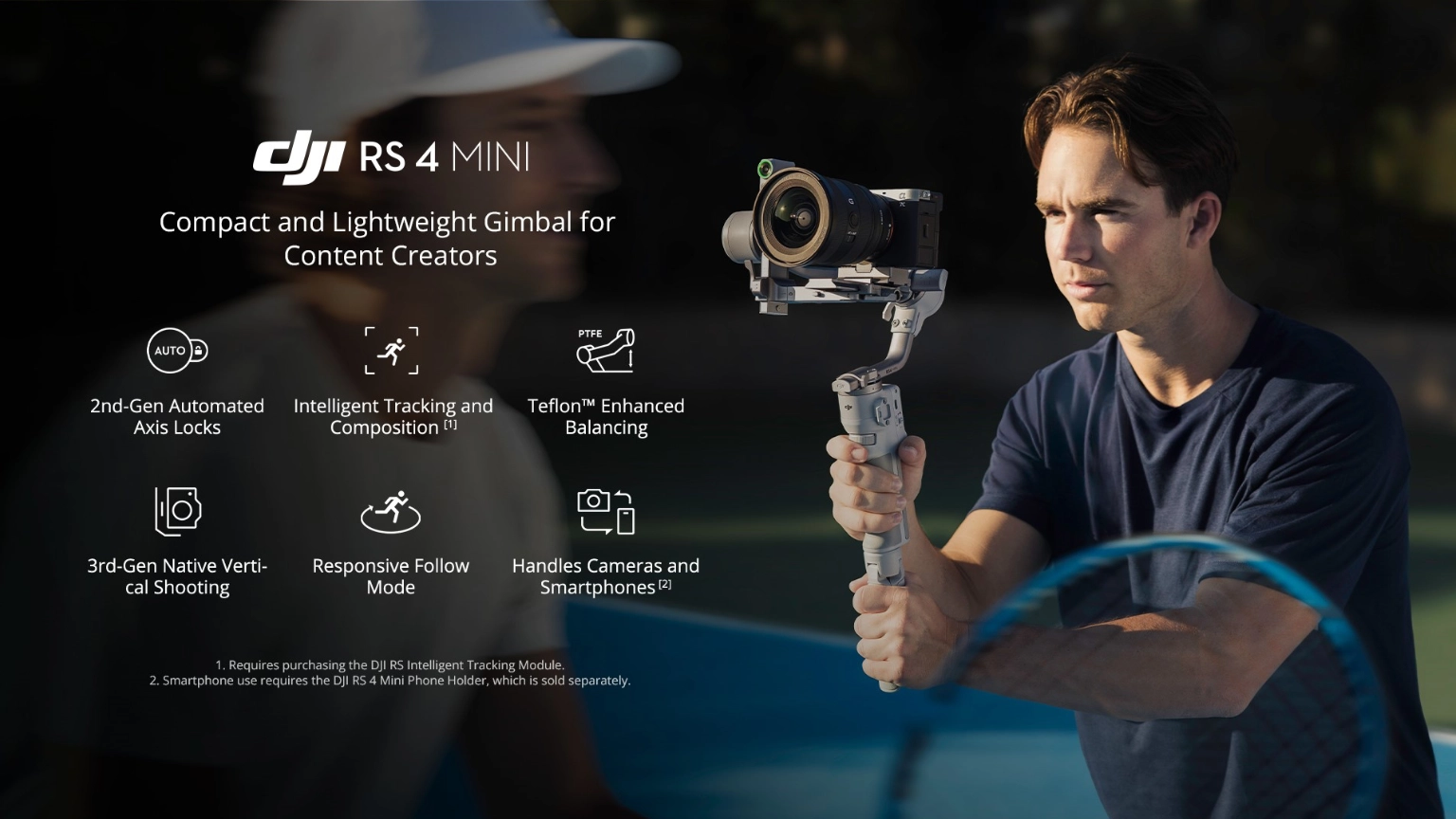DJI ได้เปิดตัว DJI RS 4 Mini กิมบอลใหม่ที่มีขนาดกะทัดรัดและน้ำหนักเบาสำหรับกล้องและสมาร์ทโฟนที่มีน้ำหนักเพียง 890 กรัม (น้อยกว่า 2 ปอนด์) และสามารถรองรับน้ำหนักได้สูงสุด 2 กิโลกรัม (4.4 ปอนด์) ออกแบบมาเพื่อตอบสนองความต้องการในการถ่ายทำอย่างรวดเร็วของครีเอเตอร์