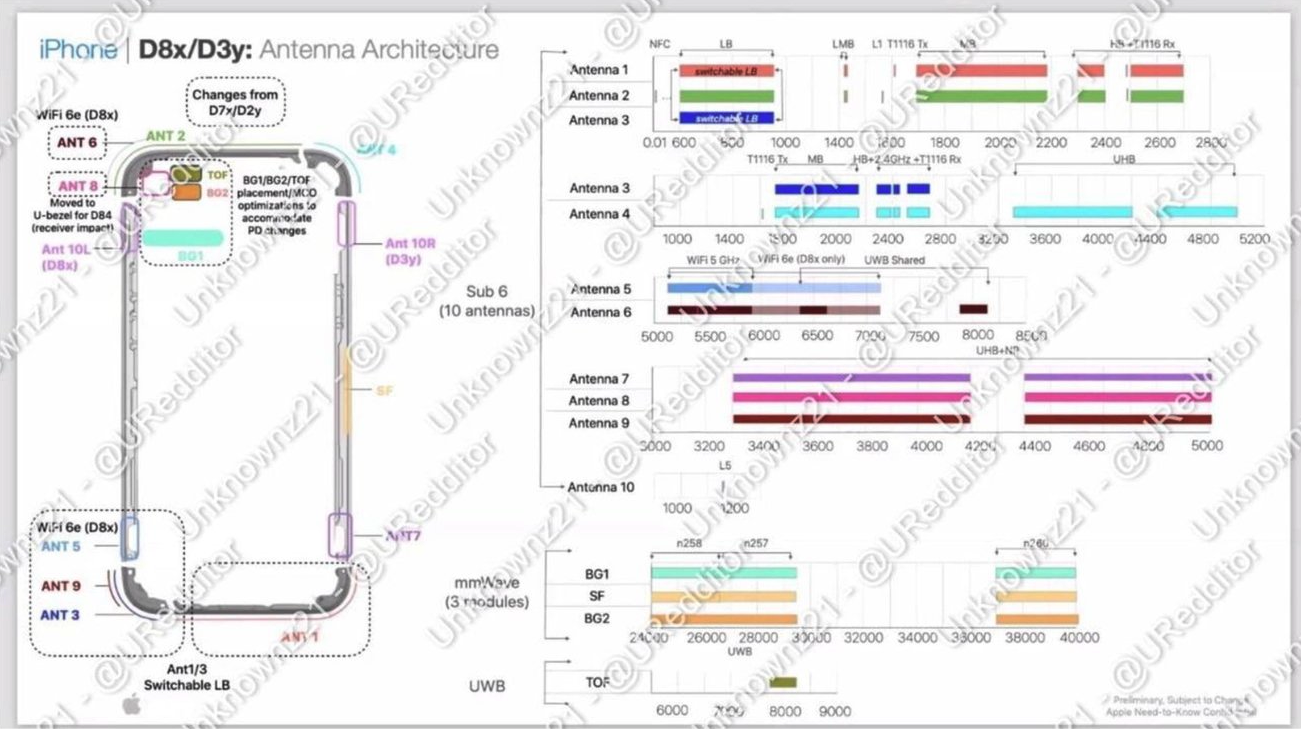 ก่อนหน้านี้เอกสารระบุว่า D7x คือ iPhone 14 Pro, 14 Pro Max ส่วน D2y คือ iPhone 14, 14 Plus ซึ่งเป็นที่มาของรหัส D8x ว่าน่าจะเป็น iPhone 15 Pro, 15 Pro Max