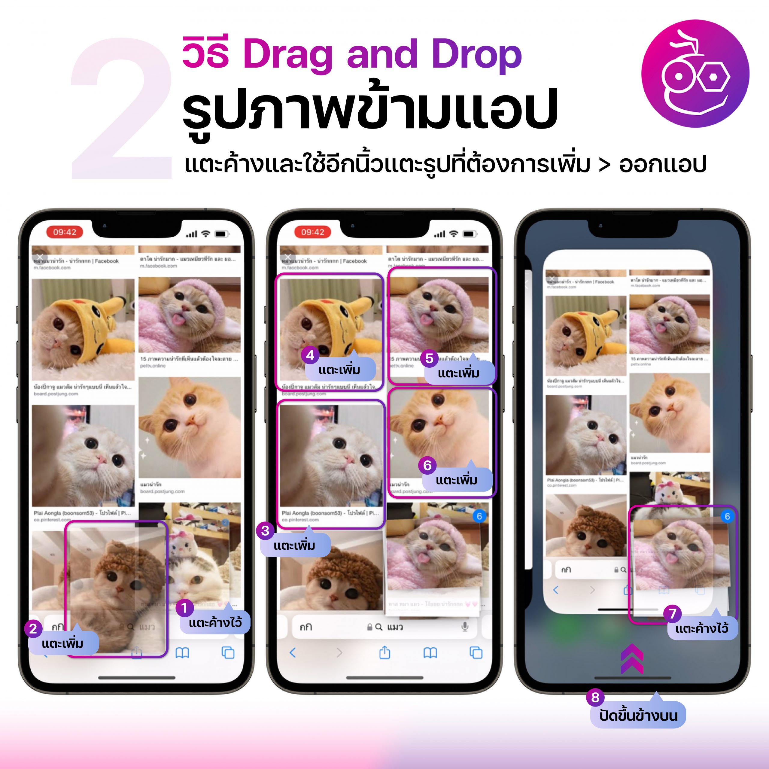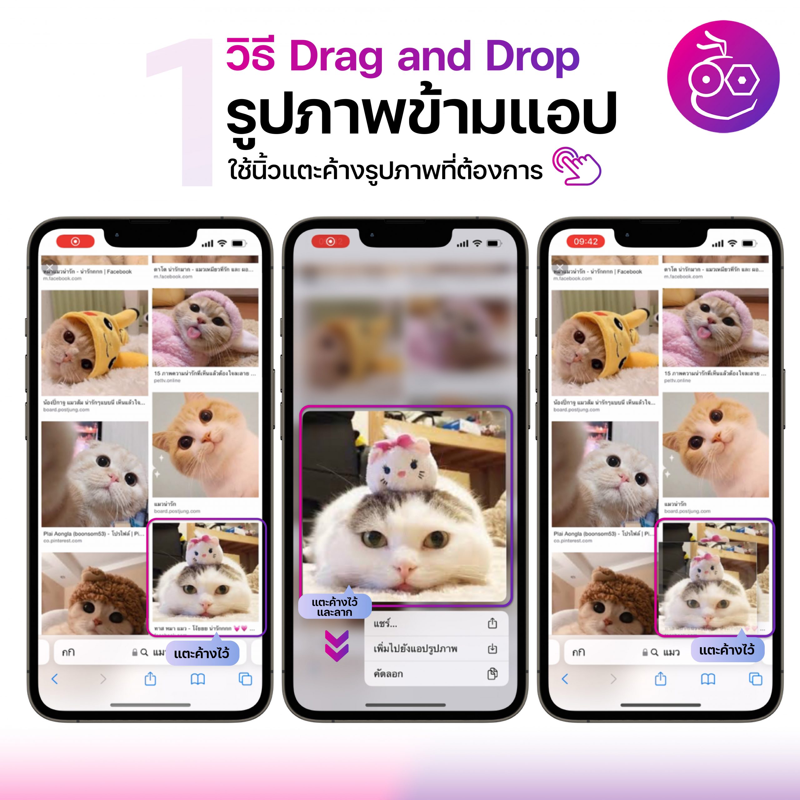 ฟีเจอร์ Drag and Drop บน iPhone เป็นการลากและวางข้ามแอปได้ ไม่ว่าจะเป็นข้อความ, รูปภาพ, ลิงก์, วิดีโอ, document, ไฟล์เสียง, PDF, และอื่น ๆ สามารถลากจากแอปหนึ่งไปยังอีกแอปหนึ่งได้ ตัวอย่างแอปที่รองรับ เช่น แอปโน้ต, Gmail, Messaes, Instagram เป็นต้น ส่วนขั้นตอนการ Drag and Drop นั้นสามารถทำตามขั้นตอนต่อไปได้เลย
