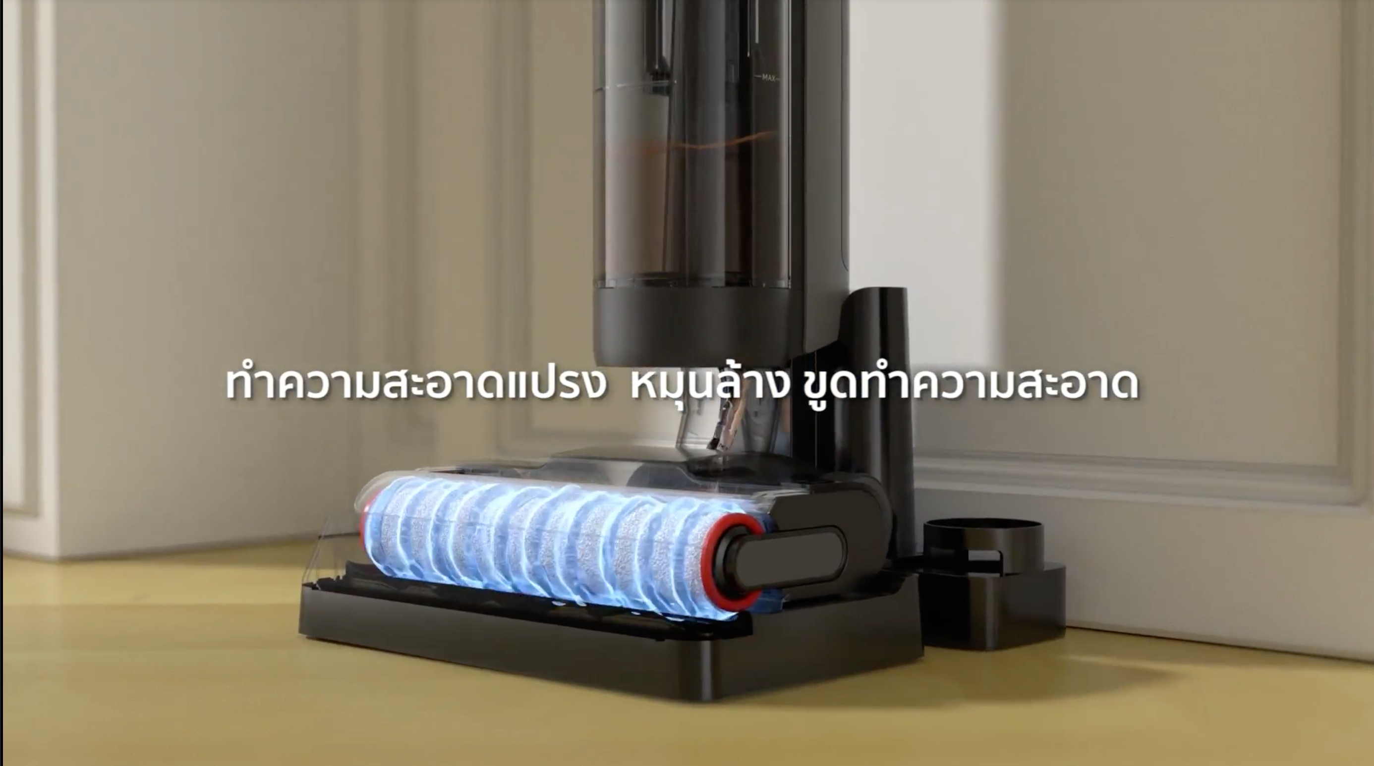 การทำความสะอาดแปรงและม๊อบหลังการใช้งานสามารถทำได้อย่างง่ายดาย ด้วยการวางเครื่องถูพื้นลงบนแท่นชาร์จและกดปุ่มเพื่อทำความสะอาดตัวเอง หัวแปรงลูกกลิ้งจะหมุมไปด้านหน้าและหลังจนกว่าจะสะอาดหมดจด 100% เพื่อพร้อมใช้งานอีกครั้ง!