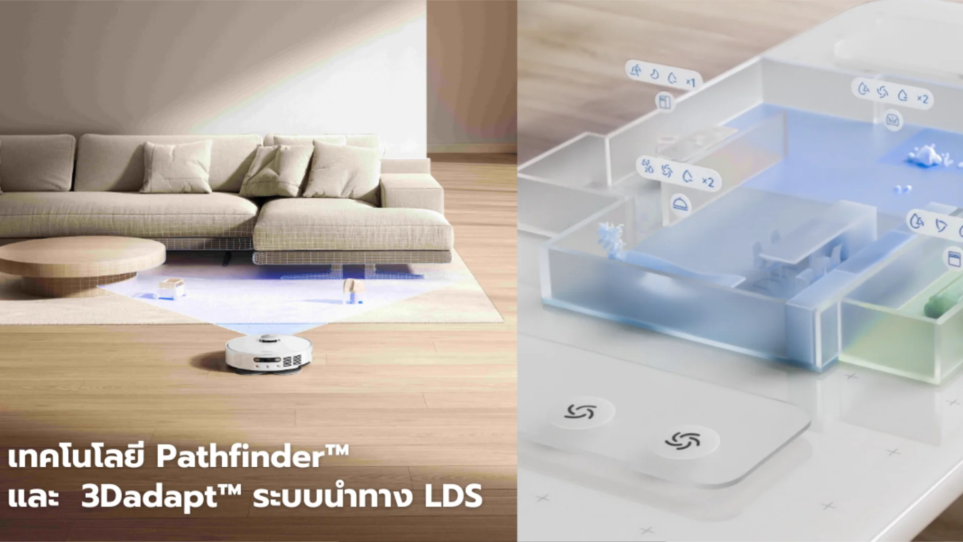 เทคโนโลยี Pathfinder™  และ  3Dadapt™ ระบบนำทาง LDS เพื่อให้สามารถวางแผนเส้นทางการทำความสะอาดได้อย่างชาญฉลาดและหลีกเลียงสิ่งกีดขวางได้อย่างแม่นยำ ในระหว่างการสร้างแผนที่ระบบจะเพิ่มข้อมูลเฟอร์นิเจอร์ผ่านการสแกน AR* ซึ่งช่วยให้แผนที่ 3 มิติมีความถูกต้องยิ่งขึ้นและเส้นทางการเคลือนที่มีความแม่นยำยิงขึ้น