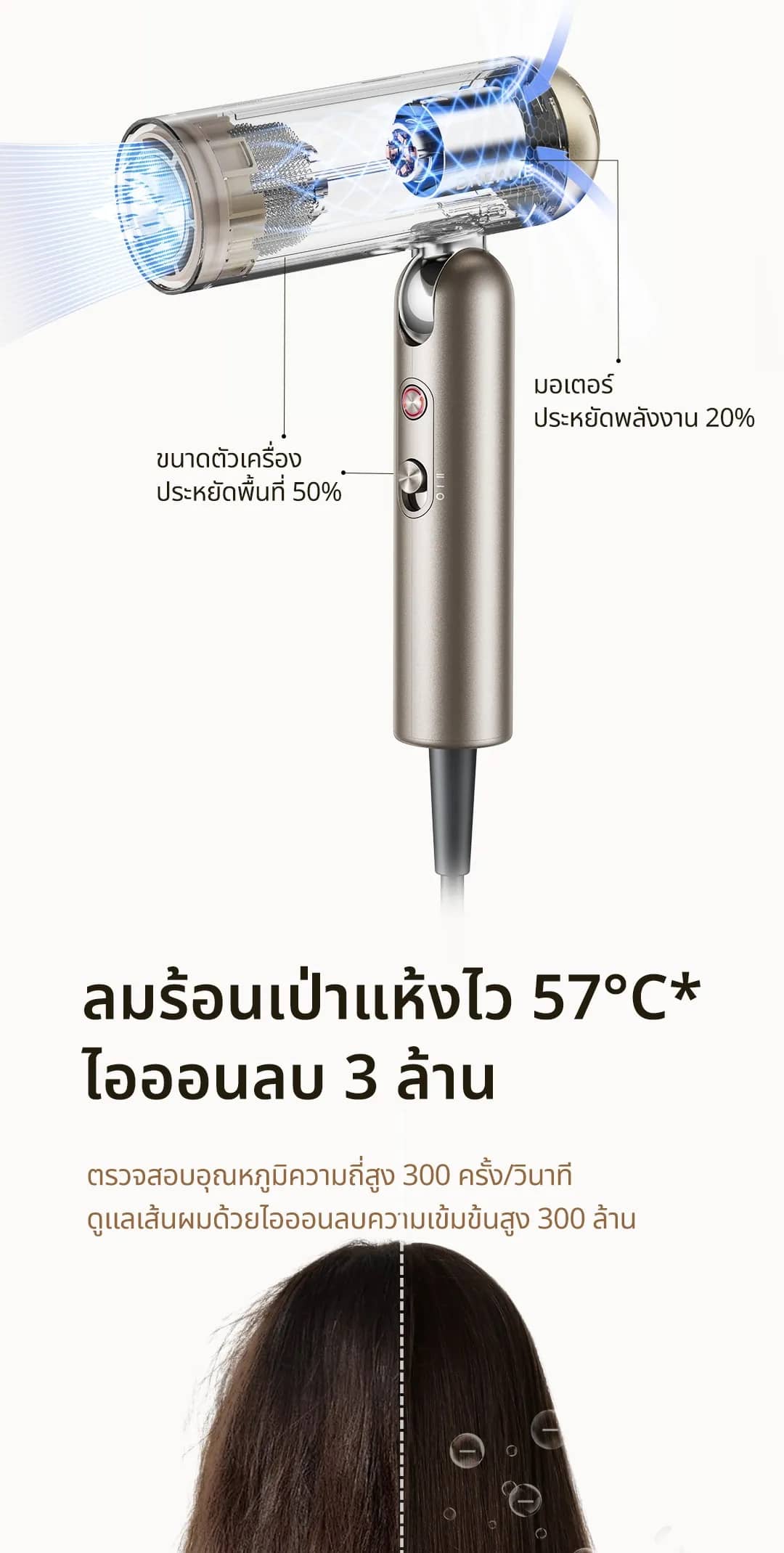 และง่ายขึ้นสำหรับมือใหม่ มีการปล่อยไอออนลบ 300,000,000*/ซม.³ ช่วยต่อต้านไฟฟ้าสถิตได้อย่างมีประสิทธิภาพ ช่วยให้เส้นผมเรียบลื่น กักเก็บความชื้นได้อย่างมีประสิทธิภาพ และป้องกันไม่ให้เส้นผมชี้ฟู