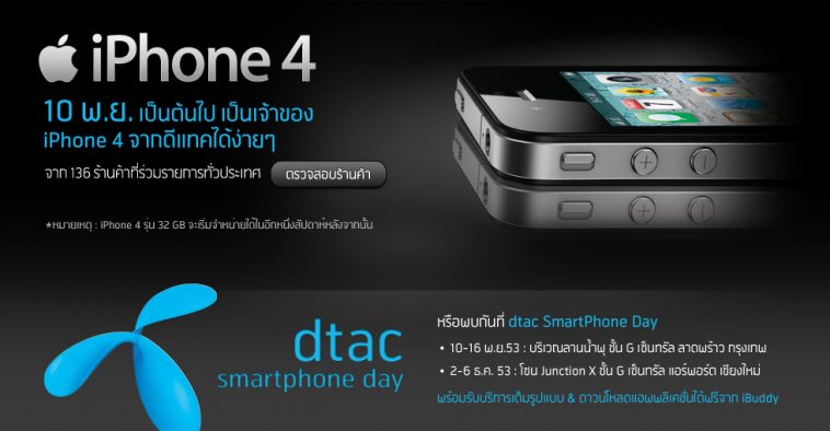 ประกาศให้ได้ทราบกันแล้วหากใครต้องการอยากจะเป็นเจ้าของสุดยอดมือถือในปัจจุบันอย่าง iPhone 4 หลังจากที่ซื้อยากซื้อเย็น ต้องจอง ต้องตอคิวแย่งกันซื้อ เกือบแม้กระทั่งจะเหยียบกันซื้อเลยทีเดียว ล่าสุด dtac ประกาศว่าจะขาย iPhone 4 พร้อมกันทั่วประเทศ วันที่ 10 พย. 2553 นี้ (พรุ่งนี้)