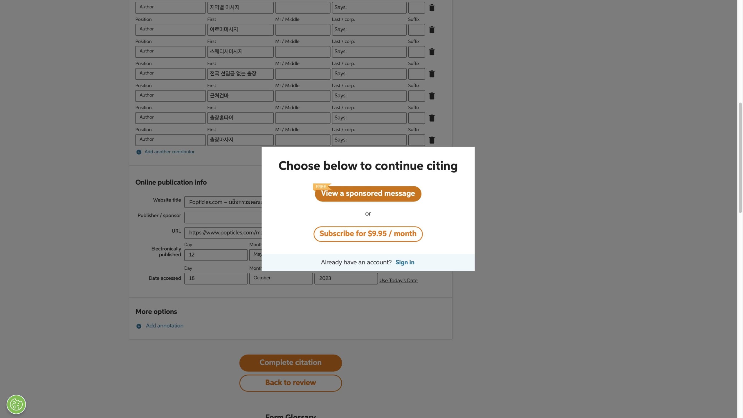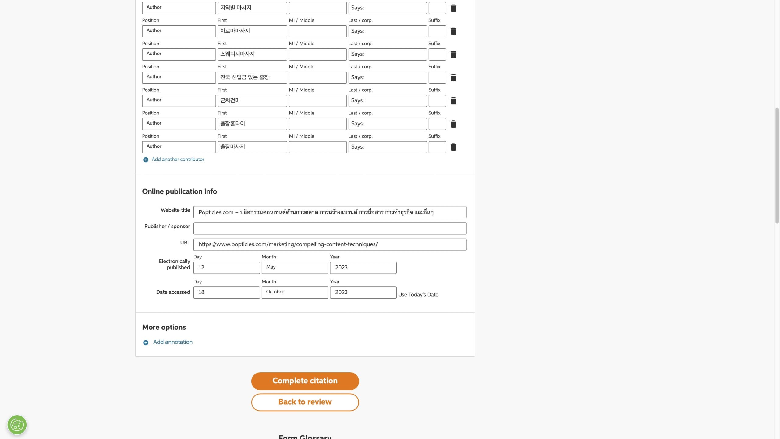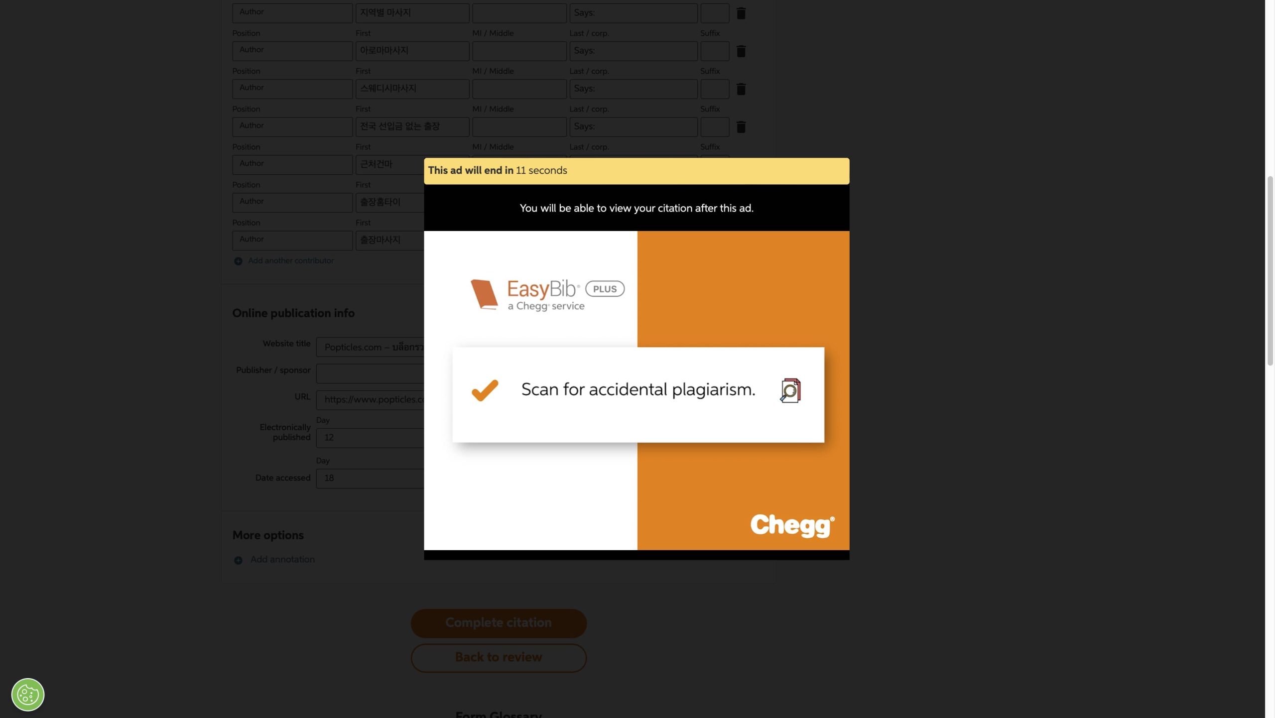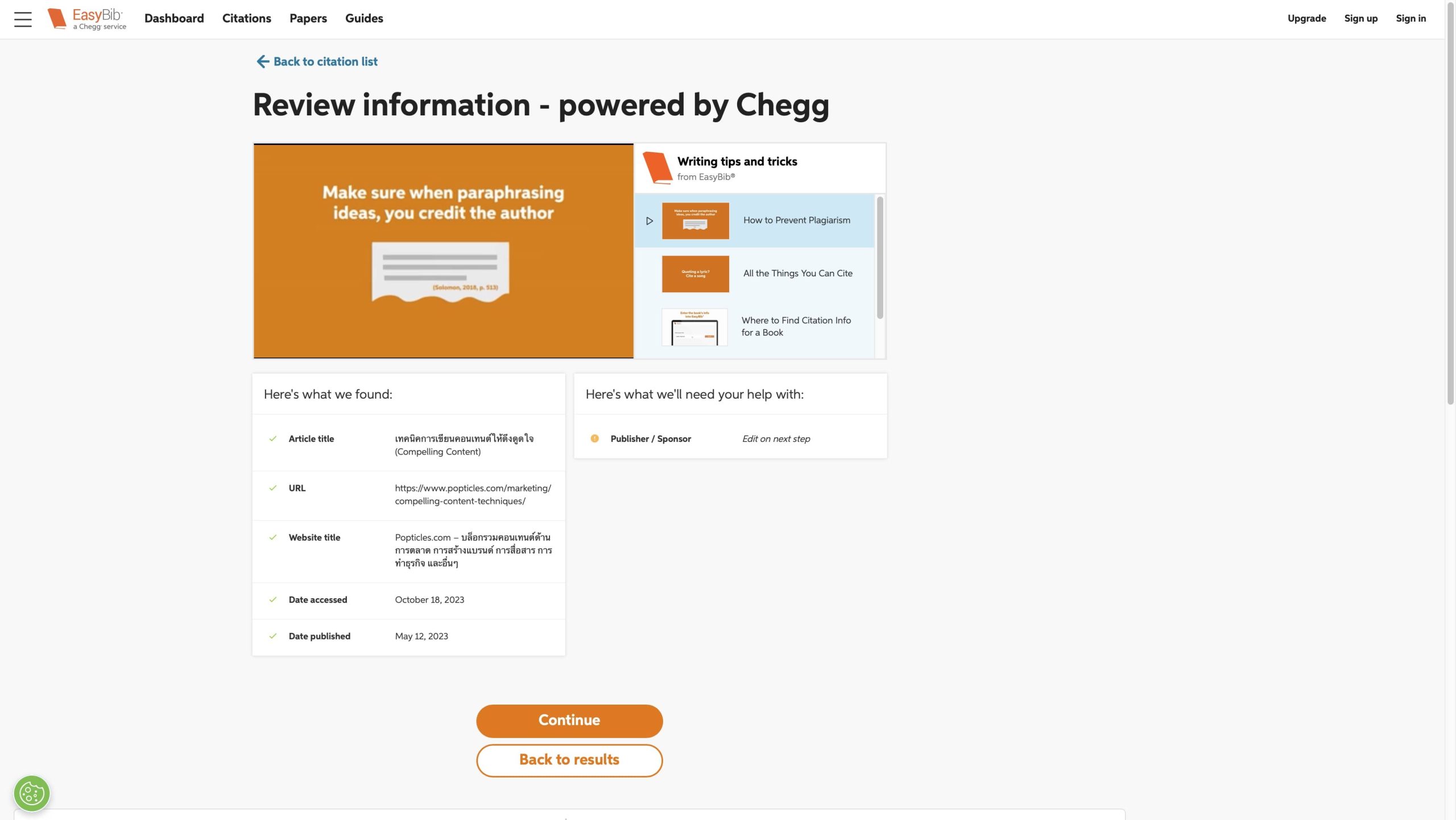 หน้านี้จะบอกทั้งผู้แต่ง, ชื่อหัวข้อ, URL, วันที่เผยแพร่, วันที่เข้าถึงข้อมูล ซึ่งเราสามารถแก้ไขเองได้เลยนะ พอเสร็จแล้วให้กด “Complete citation”