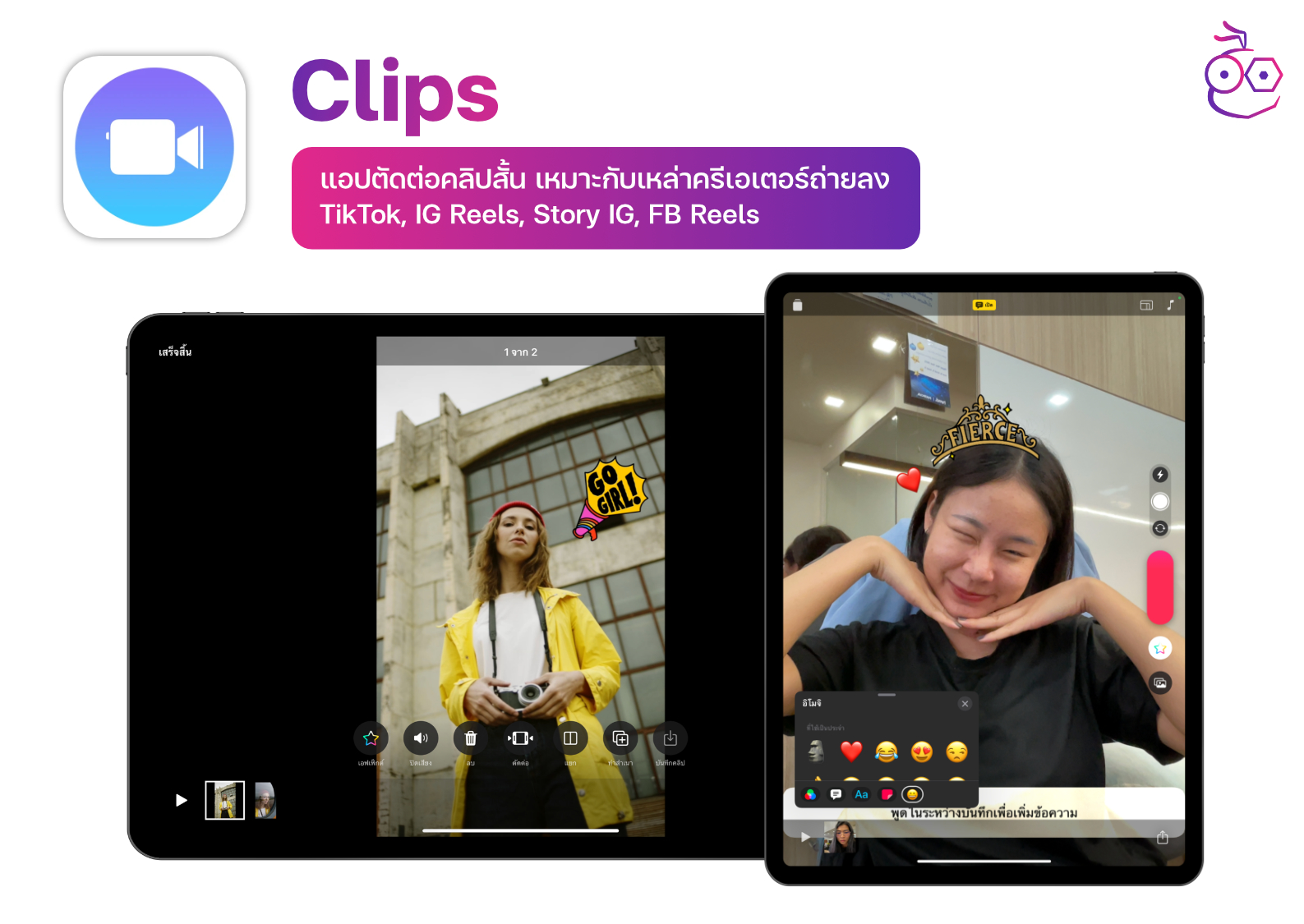 แอป Clips เป็นแอปสำหรับตัดคลิปสั้น ซึ่งจุดเด่นของแอปนี้เนี่ยสามารถกดถ่ายเป็นคลิปสั้นผ่านตัวแอปและทำการตัดต่อได้เลย จะเลือกเอฟเฟกต์ ใส่ฟิลเตอร์ ใส่สติกเกอร์ให้หน้าเรา และใส่เพลงประกอบได้ด้วย เหมาะกับเหล่าครีเอเตอร์สำหรับถ่ายลงแพลตฟอร์มสั้น ๆ อย่าง TikTok, IG Reels, Story IG, FB Reels หรือจะเพิ่มคลิปที่เราแยกมา แล้วเอาไปตัดในแอปก็สามารถทำได้เช่นกัน