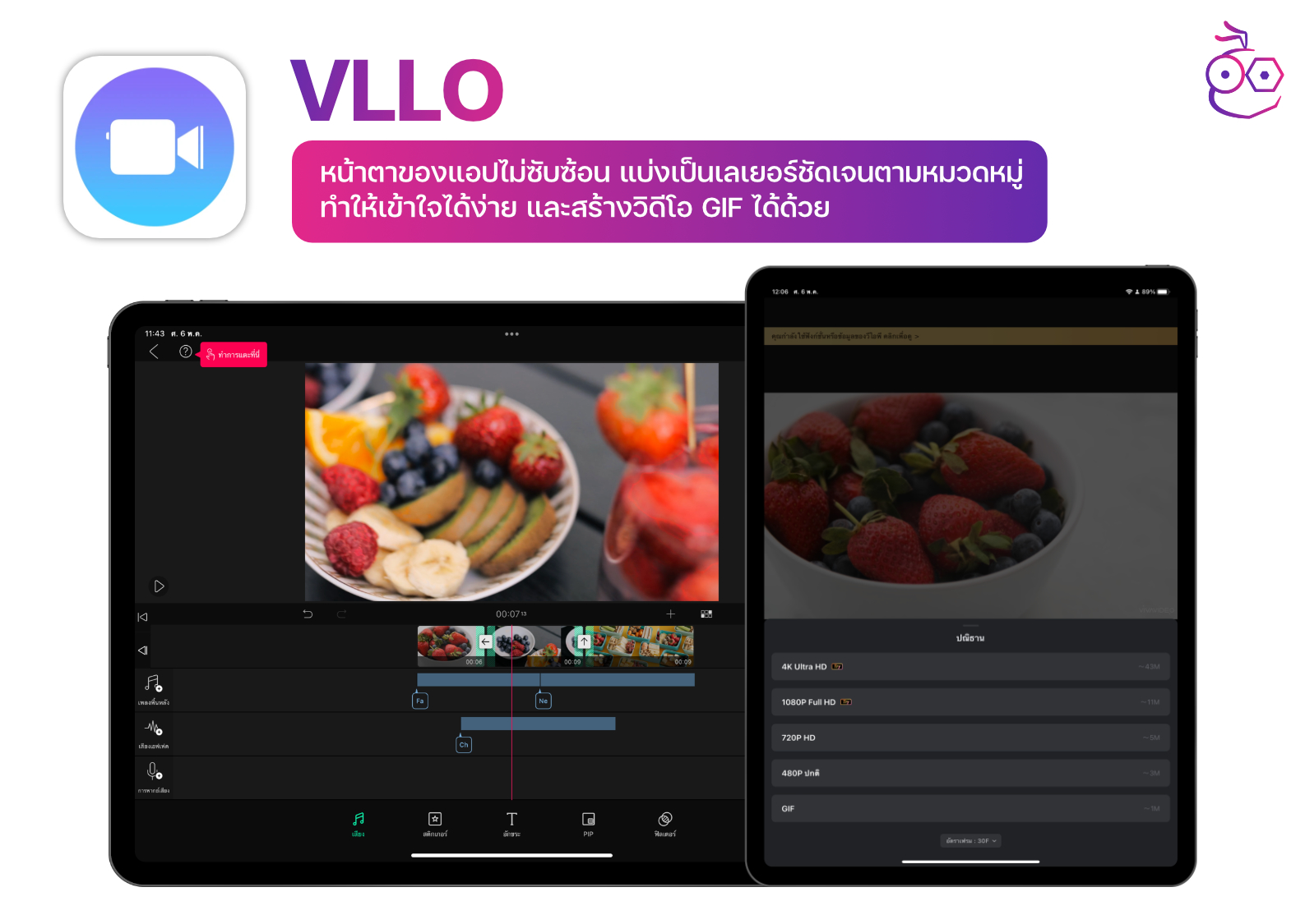 แอป VLLO เป็นแอปตัดต่อที่น่าใช้อีกแอปหนึ่งเลยก็ว่าได้ ใช้งานง่าย และการทำงานของแอปเหมือนกับแอปตัดต่อมืออาชีพเลย หน้าตาของแอปไม่ซับซ้อน โดยจะทำงานเป็นเลเยอร์ไล่ลงมา ให้เราเลือกใส่ตามหัวข้อด้านซ้ายมือ ทั้งเพลง เสียงเอฟเฟกต์ หัวข้อ หรือรูปภาพ แบ่งเป็นหมวดหมู่ให้เข้าใจได้ง่าย สามารถสร้างวิดีโอเป็น GIF ได้ ตอนกดบันทึกวิดีโอก็สามารถเลือกความละเอียดวิดีโอ เลือกเฟรมเรท ได้เหมือนแอป Inshot เลย