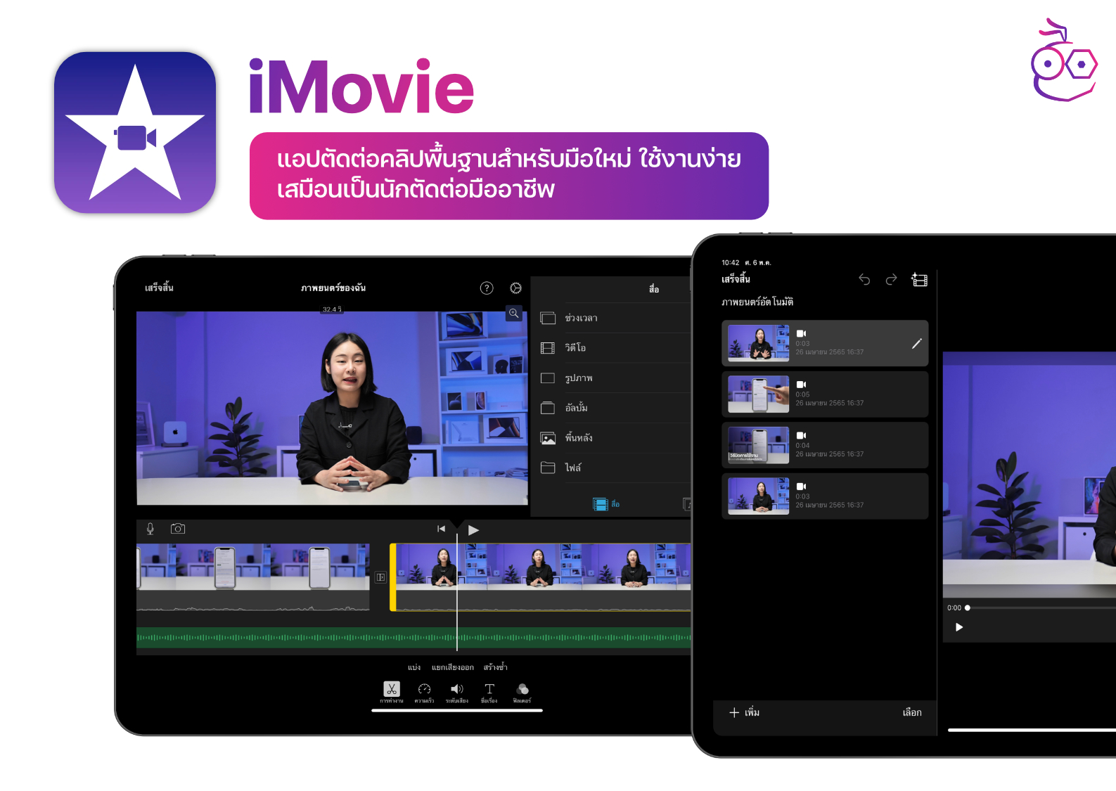 เป็นแอปตัดต่อวิดีโอพื้นฐานที่ติดมากับเครื่อง iPad อยู่แล้วเหมาะสำหรับคนที่อยากเริ่มต้นตัดคลิปง่าย ๆ มีฟีเจอร์ช่วยตัดคลิปให้อัตโนมัติด้วย เครื่องมือต่าง ๆ ไม่ซับซ้อน แต่อาจจะไม่มีลูกเล่นเยอะเหมือนแอปอื่น ๆ แต่ก็สามารถตัดต่อคลิปพื้นฐานได้ ใส่ข้อความ ใส่เพลง ใส่ Transition รวมถึงเพิ่มรูปภาพอื่น ๆ ได้