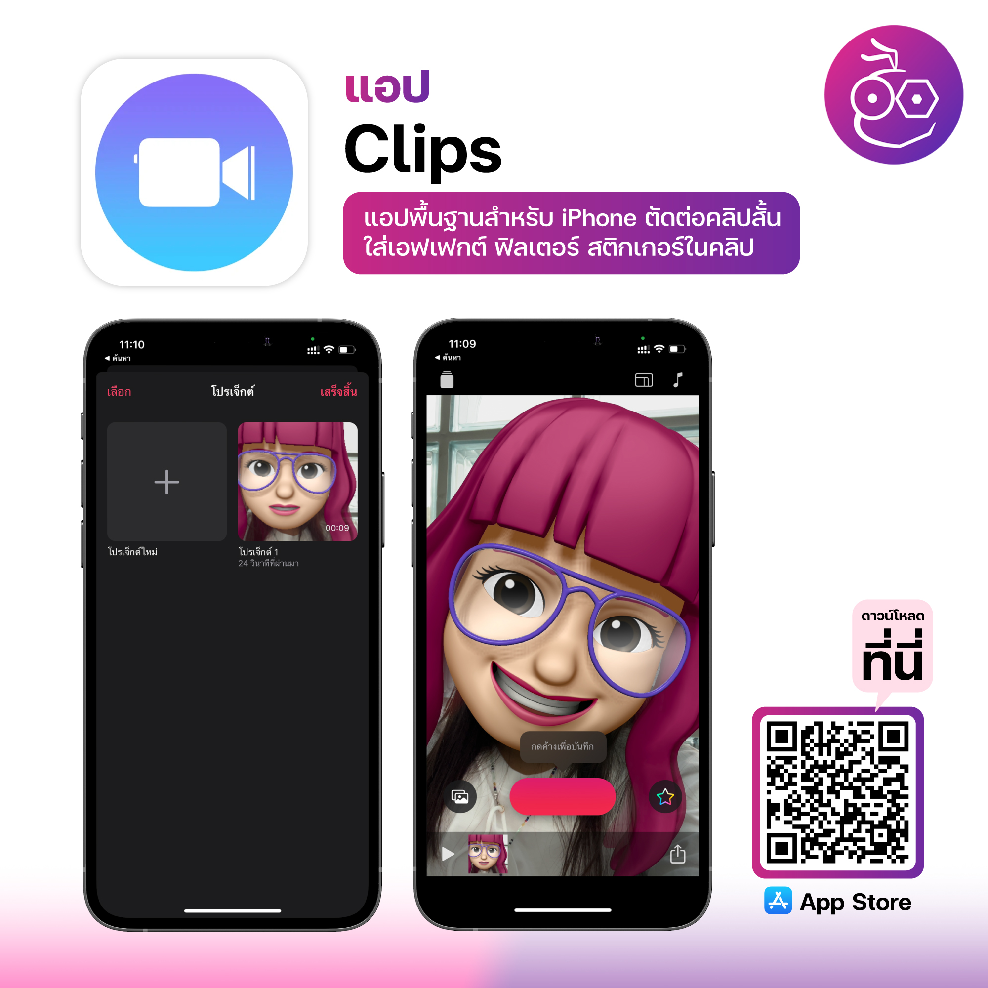 อีกแอปที่ติดมากับ iPhone ทุกเครื่องคือแอป Clips ที่เป็นแอปสำหรับตัดคลิปสั้น เราสามารถเลือกเอฟเฟกต์ ฟิลเตอร์ ใส่สติกเกอร์ให้หน้าเรา และกดถ่ายเป็นคลิปสั้น ๆ ได้ ใส่เพลงประกอบได้ด้วย เหมาะสำหรับถ่ายลงแพลตฟอร์มสั้น ๆ อย่างเช่น TikTok, Instagram Reels, Story IG