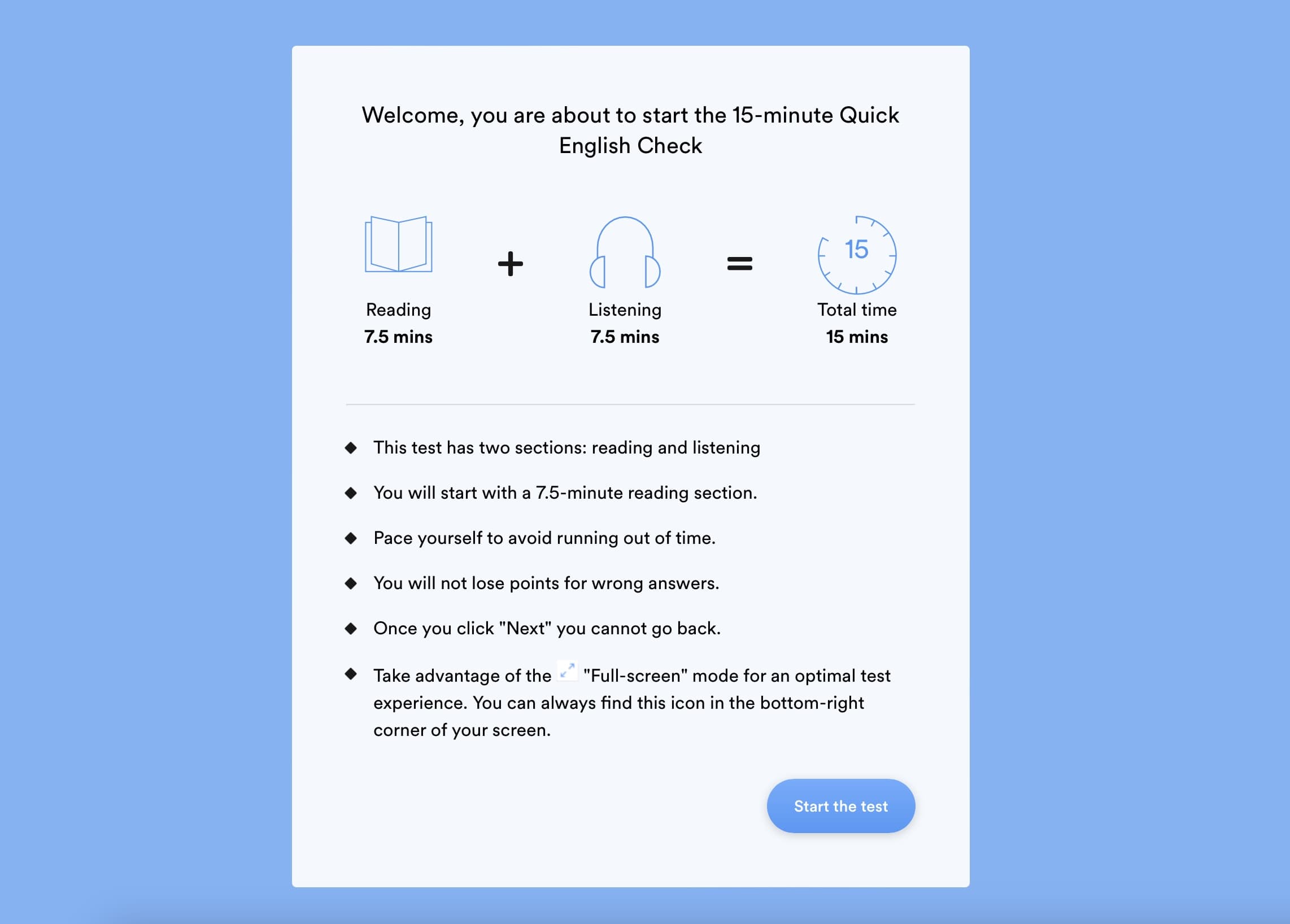 ในการสอบแบบ 15 นาที จะแบ่งเป็นพาร์ทอ่าน 7.5 นาที และพาร์ทฟัง 7.5 นาที