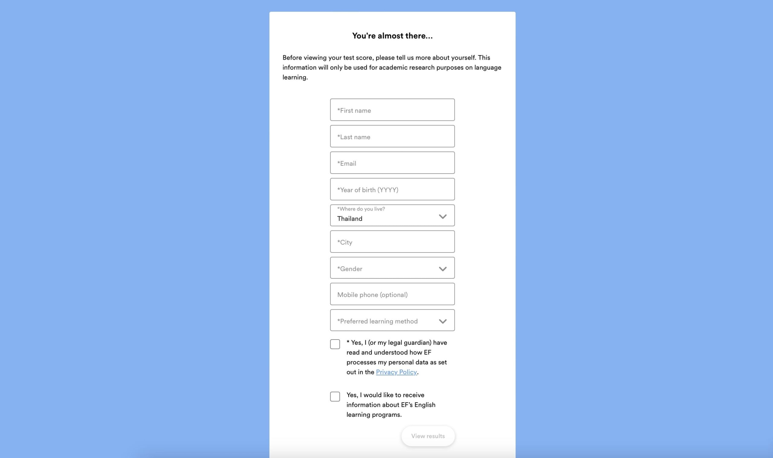 เมื่อทำข้อสอบเสร็จแล้วเราจะต้องกรอกข้อมูลให้ครบ จากนั้นให้กด “View Result” เพื่อดูคะแนน