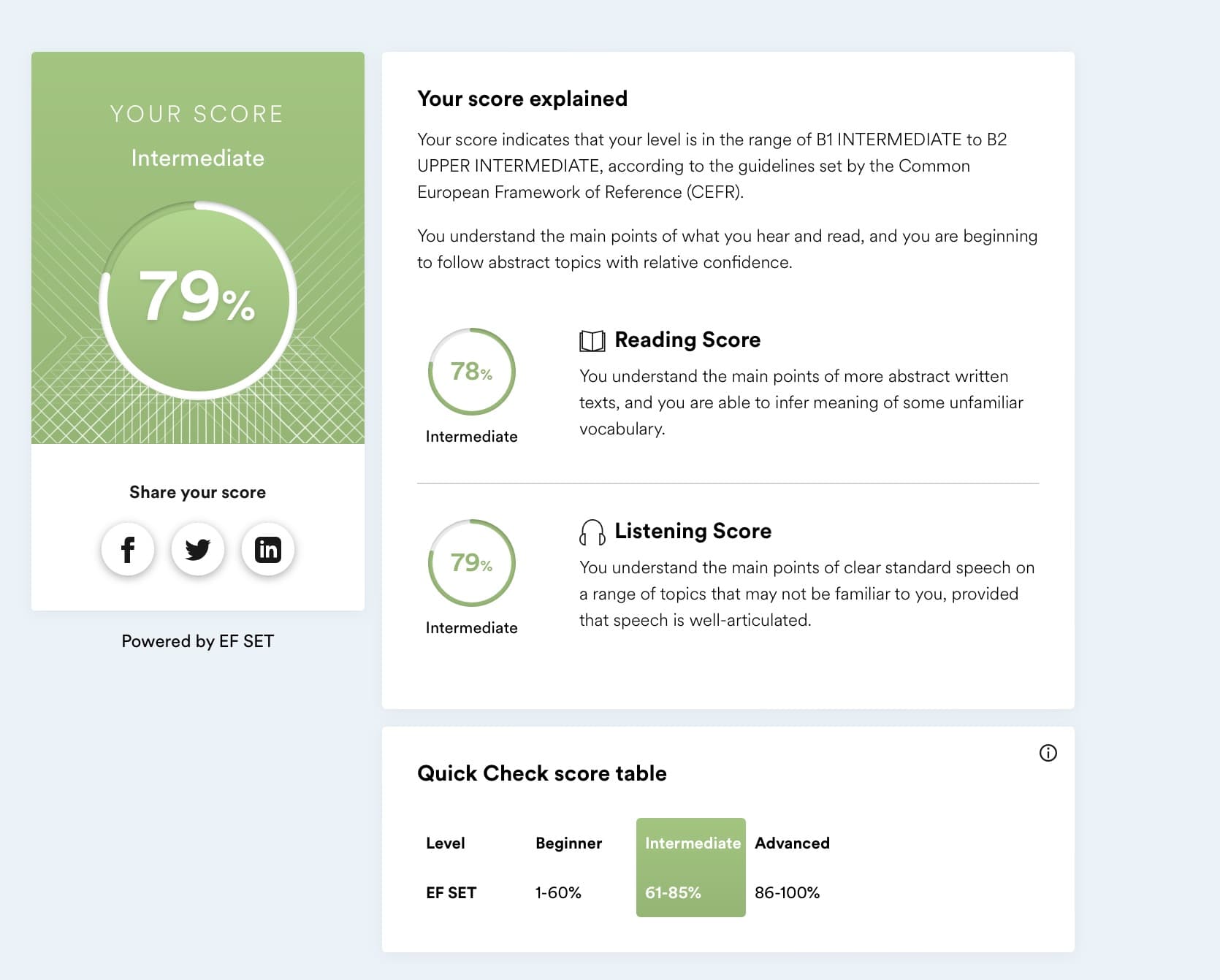 มีการบอกคะแนนทั้งสองพาร์ท พร้อมทั้งบอกระดับภาษาของเรา โดยมีระดับ Beginner, Intermediate และ Advanced