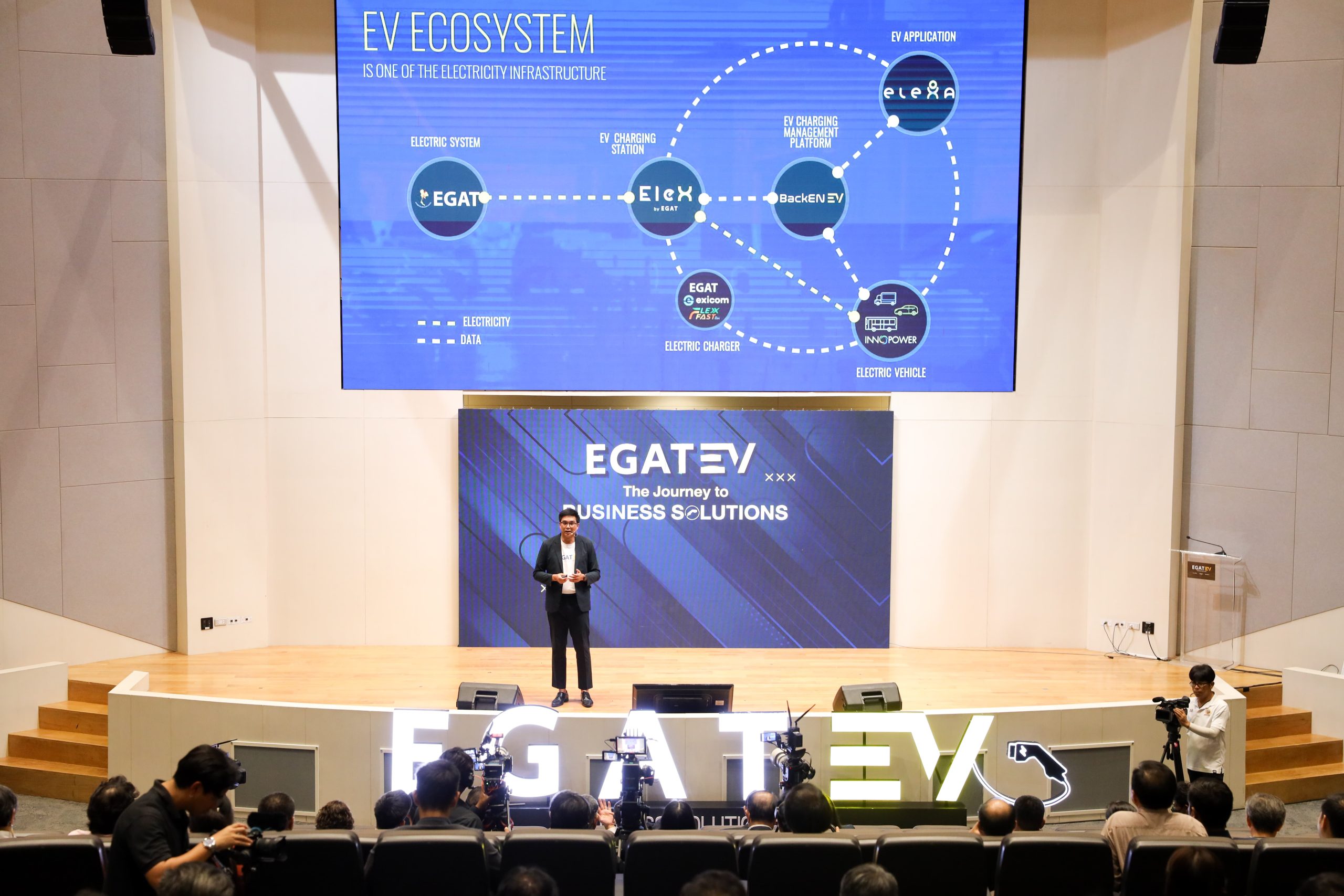 นายเทพรัตน์ เทพพิทักษ์ ผู้ว่าการ กฟผ. กล่าวว่า ตลอดระยะเวลา 3 ปี กฟผ. ร่วมขับเคลื่อนการสร้างระบบนิเวศด้านยานยนต์ไฟฟ้าให้เข้มแข็งมาอย่างต่อเนื่อง เพื่อสร้างความมั่นใจให้คนไทยเปลี่ยนมาใช้ยานยนต์ไฟฟ้า และดึงดูดผู้ลงทุนต่างชาติเข้ามาลงทุนอุตสาหกรรมด้านยานยนต์ไฟฟ้าในประเทศไทย ผ่านการพัฒนาสถานีชาร์จรถยนต์ไฟฟ้า EleX by EGAT การพัฒนาดิจิทัลแพลตฟอร์ม แอปพลิเคชัน EleXA การพัฒนาระบบบริหารจัดการสถานีชาร์จรถยนต์ไฟฟ้า BackEN EV ซึ่งประสบการณ์นี้สร้างให้ กฟผ. เป็นผู้เชี่ยวชาญด้าน EV Business Solutions อย่างเต็มรูปแบบ พร้อมเปิดรับให้คำปรึกษาสำหรับผู้สนใจลงทุนธุรกิจสถานีชาร์จรถยนต์ไฟฟ้า และให้บริการระบบ BackEN EV ที่ช่วยให้ผู้ประกอบการสามารถบริหารจัดการสถานีได้อย่างมีประสิทธิภาพ