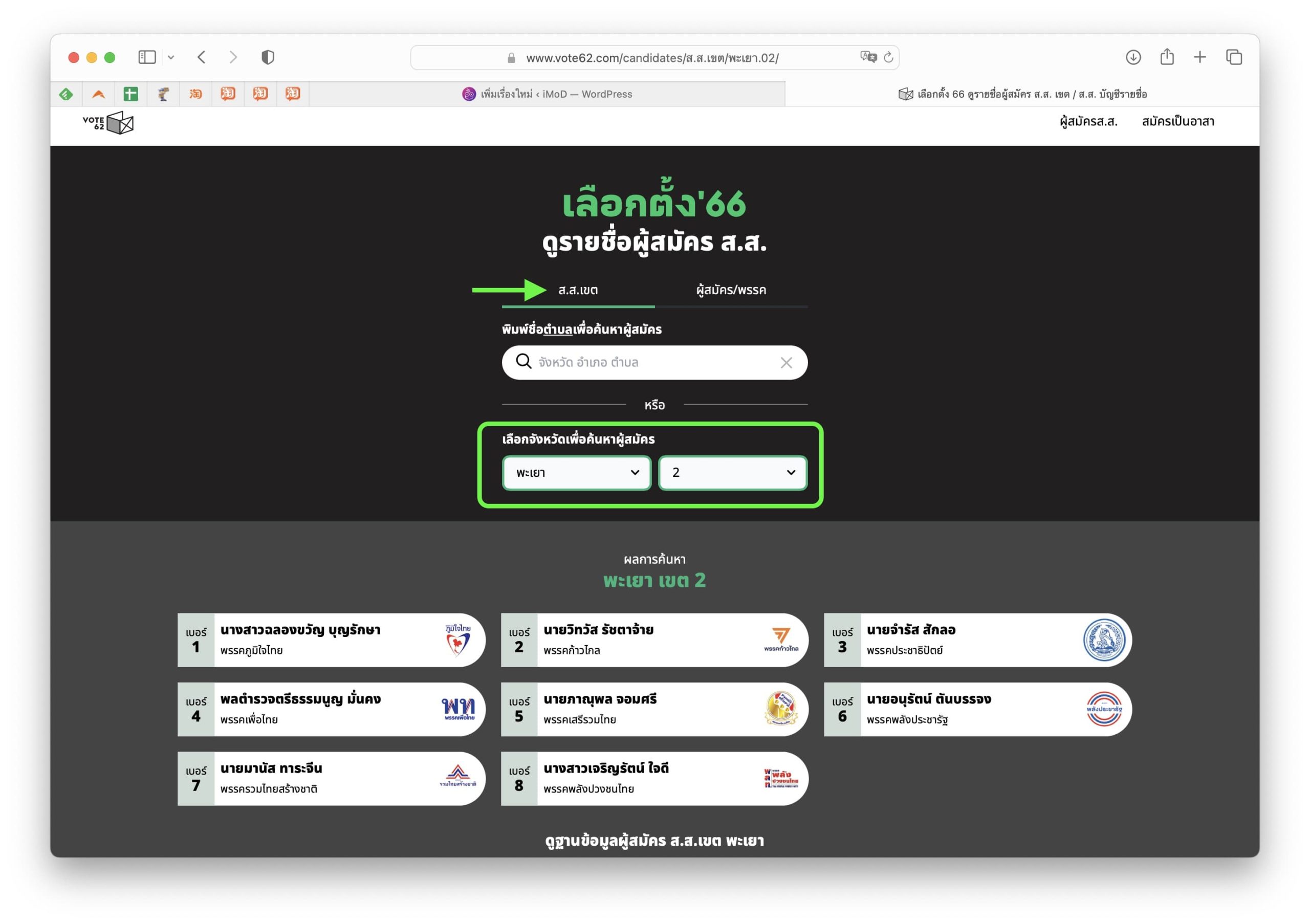 หากอยากดูรายชื่อผู้สมัคร ส.ส. แบบแบ่งเขต ให้เลือกจังหวัด พร้อมเขต ที่เราอาศัยอยู่ตามทะเบียนบ้าน และดูข้อมูลได้เลย