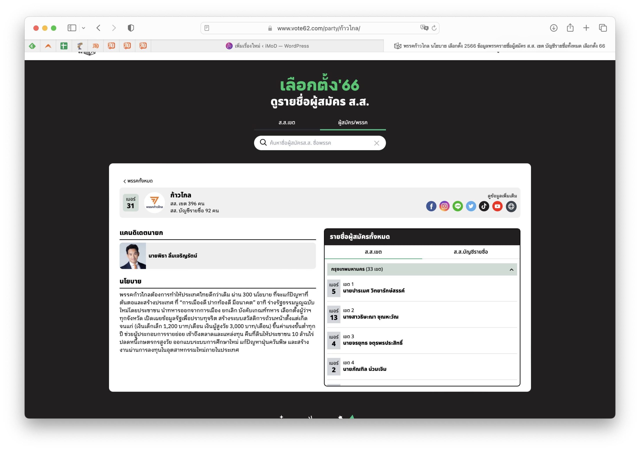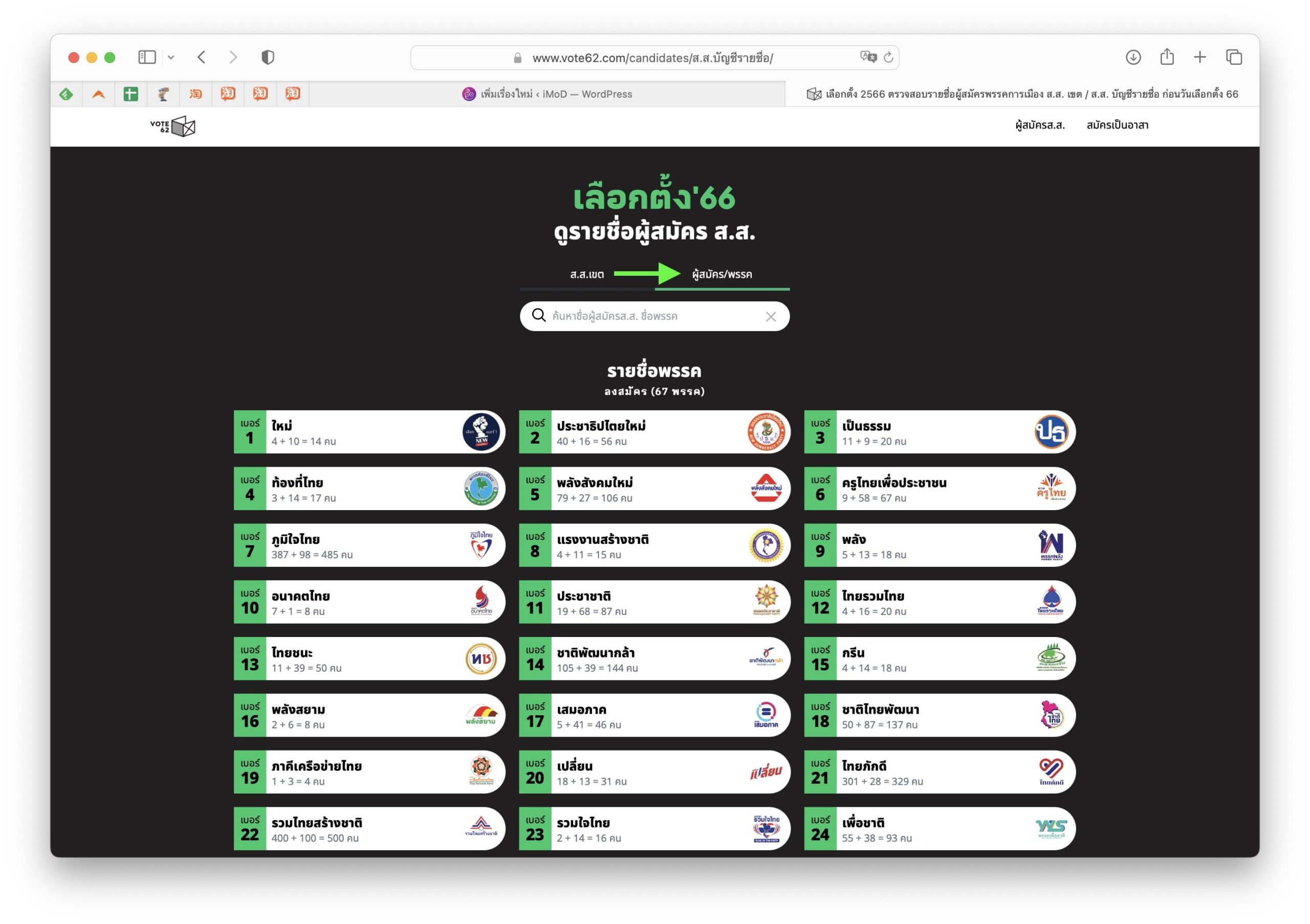 เราจะสามารถเข้ามาอ่านข้อมูลของแต่ละพรรค / จำนวน ส.ส. แบ่งเขต / จำนวน ส.ส. แบบบัญชีรายชื่อ /นโยบายพรรค และข้อมูลผู้สมัคร ส.ส. ที่สังกัด พรรคนั้น ๆ ได้ในหน้านี้